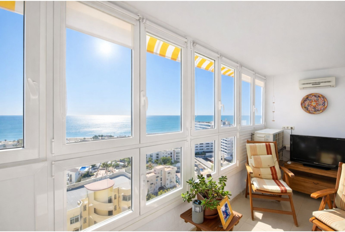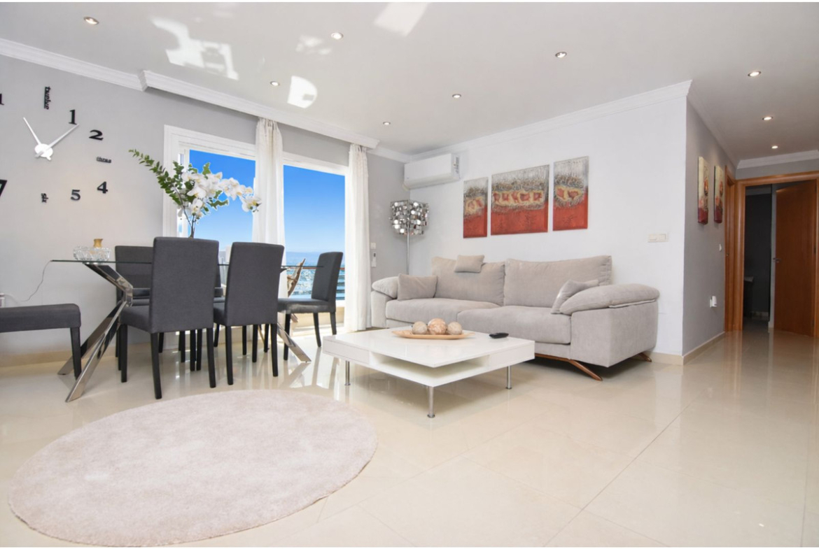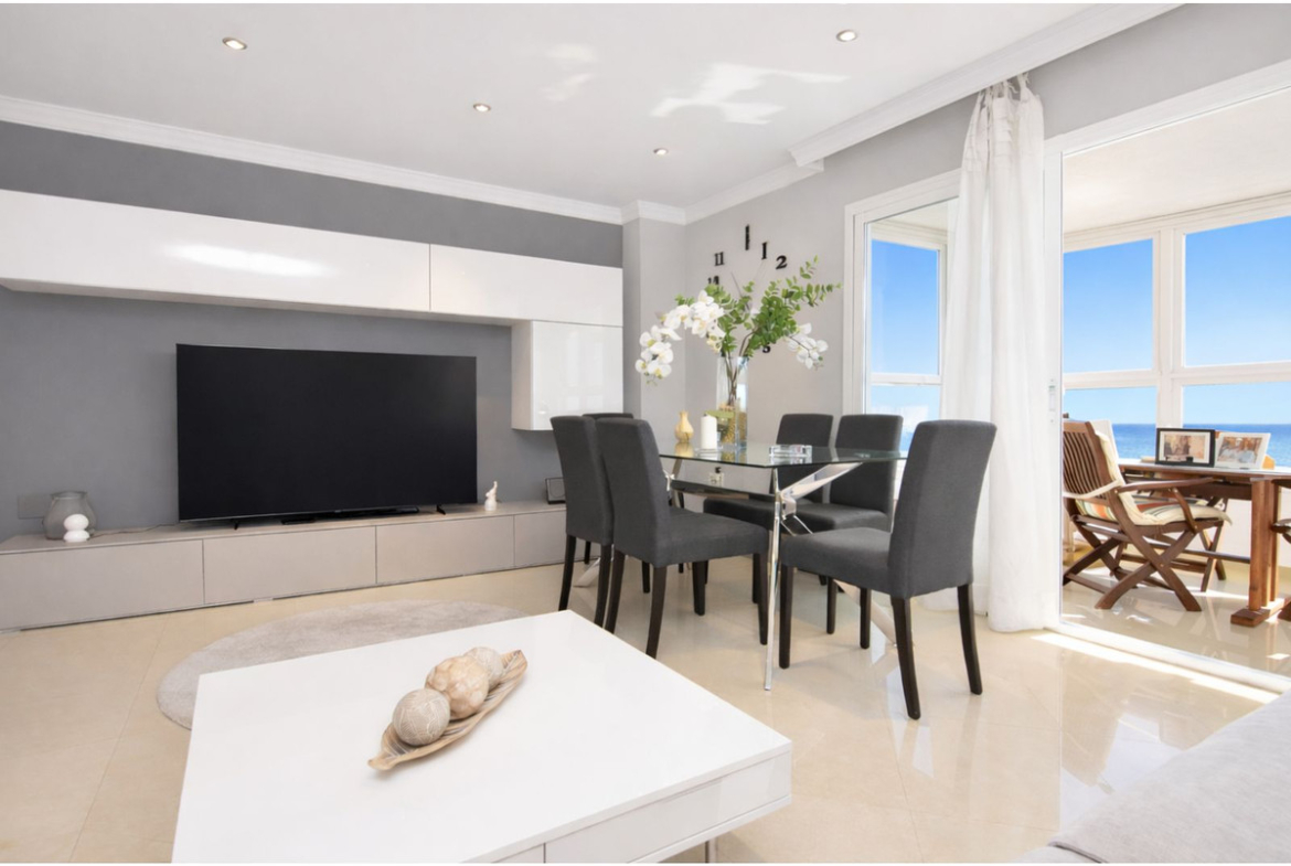 The property is bright and enjoys beautiful sea views with an ideal south-facing aspect. The property offers a practical layout: it features a fully equipped, modern and separate kitchen that could easily be opened up to the living room, porcelain tiled floors, air conditioning, double glazing and new doors; it is ready to move into immediately.