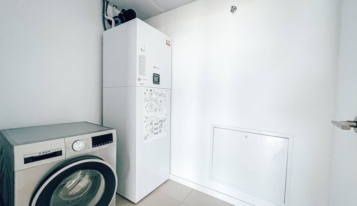Fully equipped kitchen with Bosch appliances, porcelain stoneware floors, panoramic energy-efficient windows, electric shutters and aerothermal climate control system.