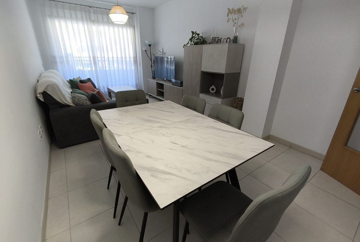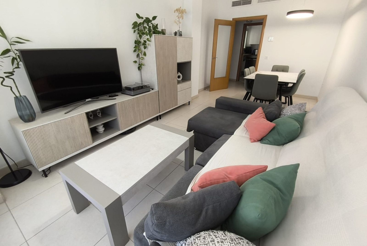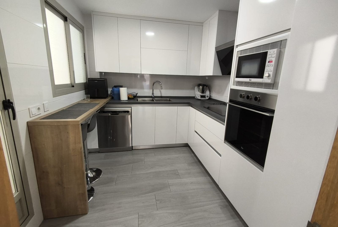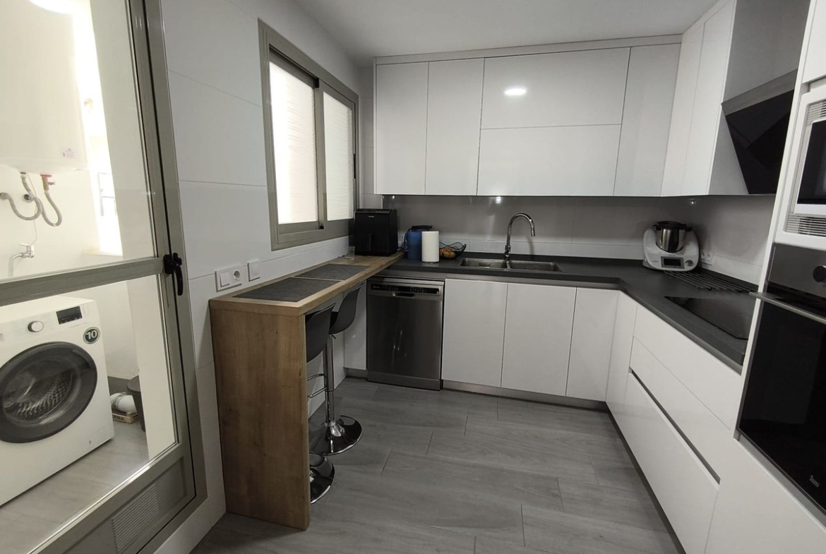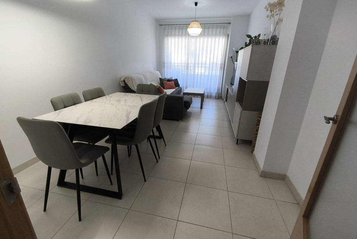 The property features 3 bedrooms with built-in wardrobes, 2 full bathrooms (one of them en-suite in the master bedroom), a separate fully fitted kitchen with appliances, and a bright living-dining room with direct access to a pleasant terrace of approximately 11 m², perfect for enjoying the wonderful climate all year round.