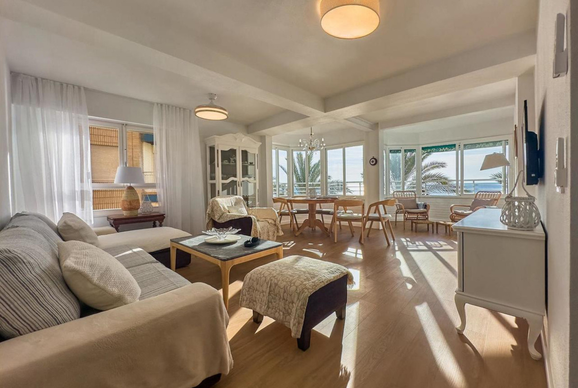 An exclusive, fully renovated apartment on the frontline in the heart of Torrevieja with stunning sea views. The apartment features three spacious bedrooms, two modern bathrooms, high ceilings, wooden floors, and high-quality double-glazed windows, creating a cozy and elegant atmosphere. Its southwest orientation ensures excellent natural light throughout the day. The fully equipped kitchen is ready for immediate use, while the central air conditioning system with heating and cooling modes guarantees comfort all year round. Built-in wardrobes provide optimal storage, and the building has an elevator for added convenience. For security, an alarm system is installed. The apartment also includes an independent laundry room, as well as all necessary furniture and a TV. All utilities, including water and electrical wiring, are brand new and in perfect condition. The location is ideal for both living and investment, with bars, restaurants, supermarkets, schools, hospitals, and universities just a short walk away. Nearby, you’ll also find parks, playgrounds, green areas, golf courses, and entertainment centers. Community fees are €68 per month. This is a perfect home for those looking to enjoy comfort, the sea, and a well-developed infrastructure in the very heart of Torrevieja.