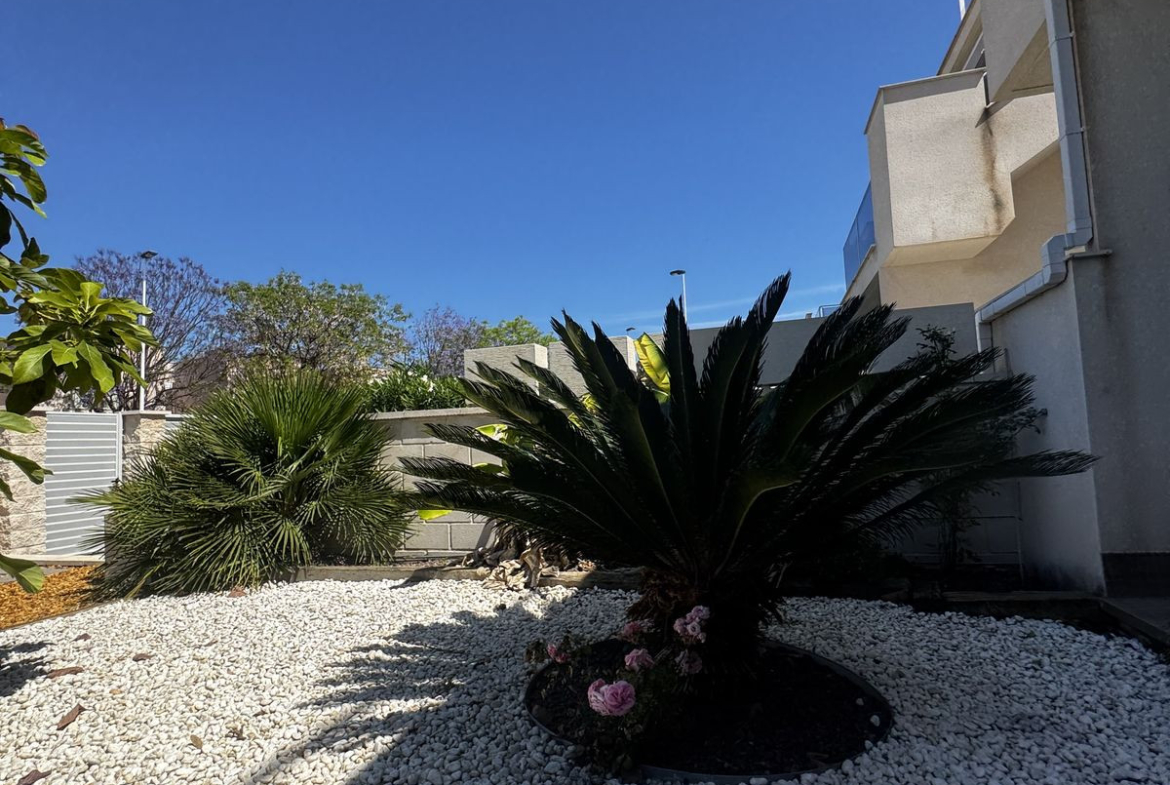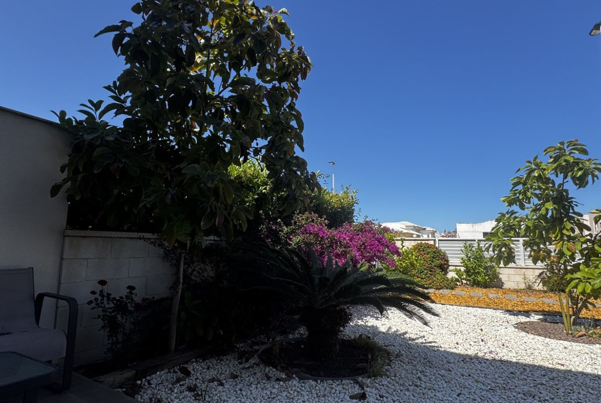 The property offers 93.10 m² built (80.75 m² usable) and sits on a plot of 104.78 m², featuring a beautiful garden with decorative plants and a spacious 50 m² terrace, ideal for enjoying the Mediterranean lifestyle.
