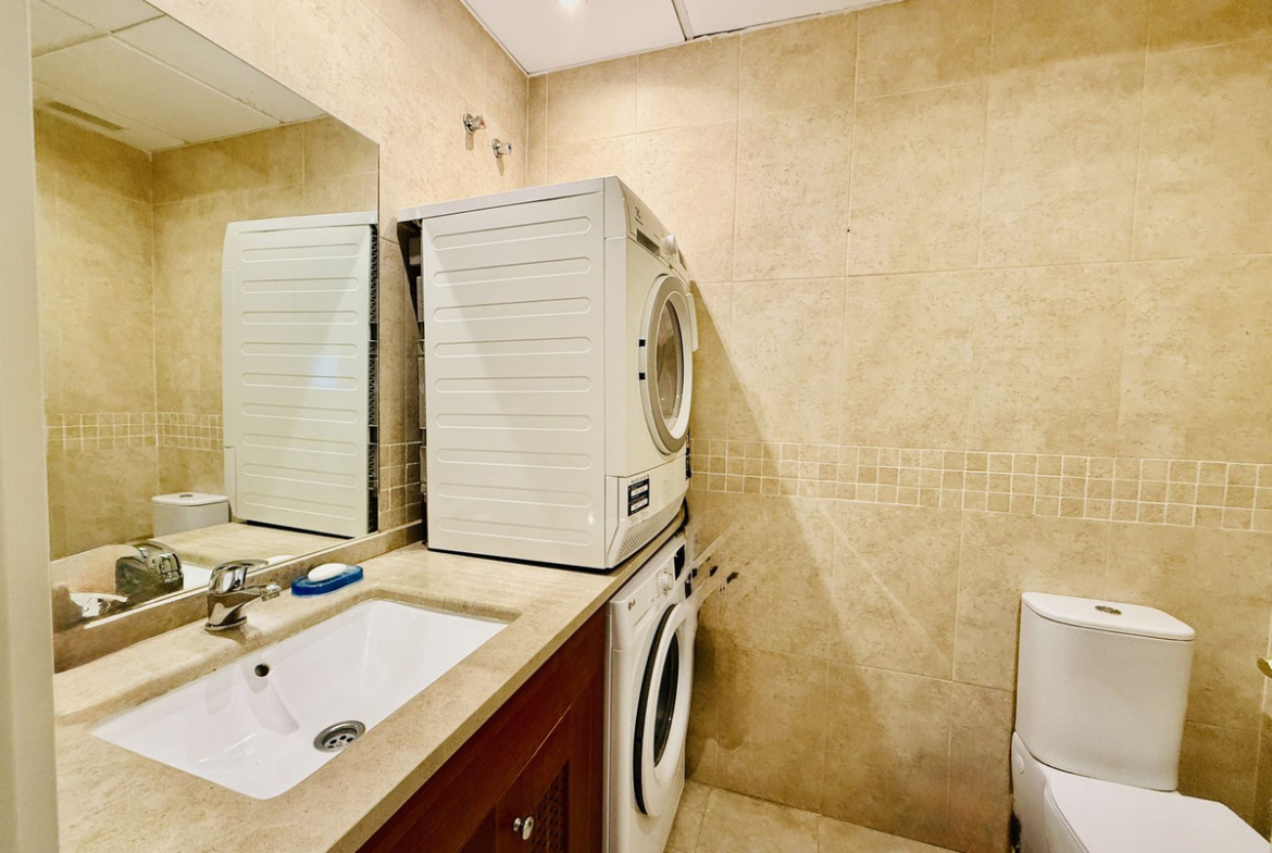 On the main floor, we enter the house through the landscaped porch, where we find a spacious living-dining room with a fireplace, a fully equipped open kitchen and a guest toilet. Direct access to the private terrace with views of the golf course.