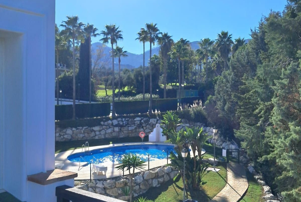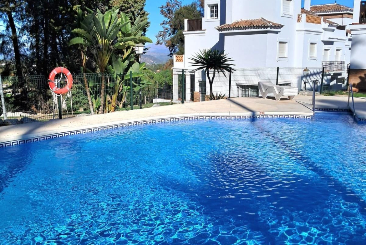 Townhouse for sale in Lauro Golf one of the most prestigious golf courses in Malaga. The property is distributed over three floors. On the ground floor there is a fully equipped kitchen, a toilet, a large living room with a fireplace that leads to a private terrace. On the upper floor there are two en-suite bedrooms and on the top floor there is a third bedroom with a terrace with wonderful views of the golf course. Private parking space and storeroom. Communal gardens a pool. A unique purchase opportunity not to be missed.