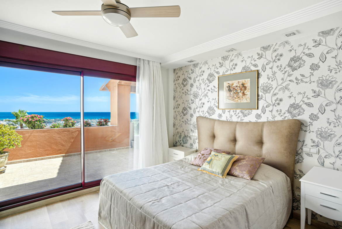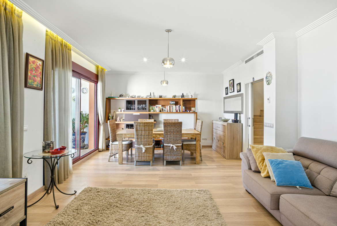 Beautiful townhouse in the prestigious Los Jaralillos community, located in the sought-after El Paraíso area of Benahavís. Within walking distance to the beach, golf courses, shops, restaurants, cafés, and international schools. Spread over four floors, this charming home features private gardens and offers stunning sea views from several terraces. The main floor comprises a fully equipped kitchen, spacious living-dining area, laundry area, guest toilet, and a large terrace with sea views that provides direct access to the private garden. The first floor offers two bedrooms, both with access to a terrace with sea views. The master bedroom is en suite, and this floor also includes an additional bathroom and a small sitting area. The upper floor is dedicated to a solarium with a generous terrace, perfect for sunbathing or enjoying the views. The basement houses the machine room and a utility room. The property offers the perfect combination of comfort and location, within a gated community, with beautifully maintained gardens and a large communal swimming pool. Additional features include wooden flooring, air conditioning, and a parking space. This townhouse combines comfort, privacy, and a privileged location.