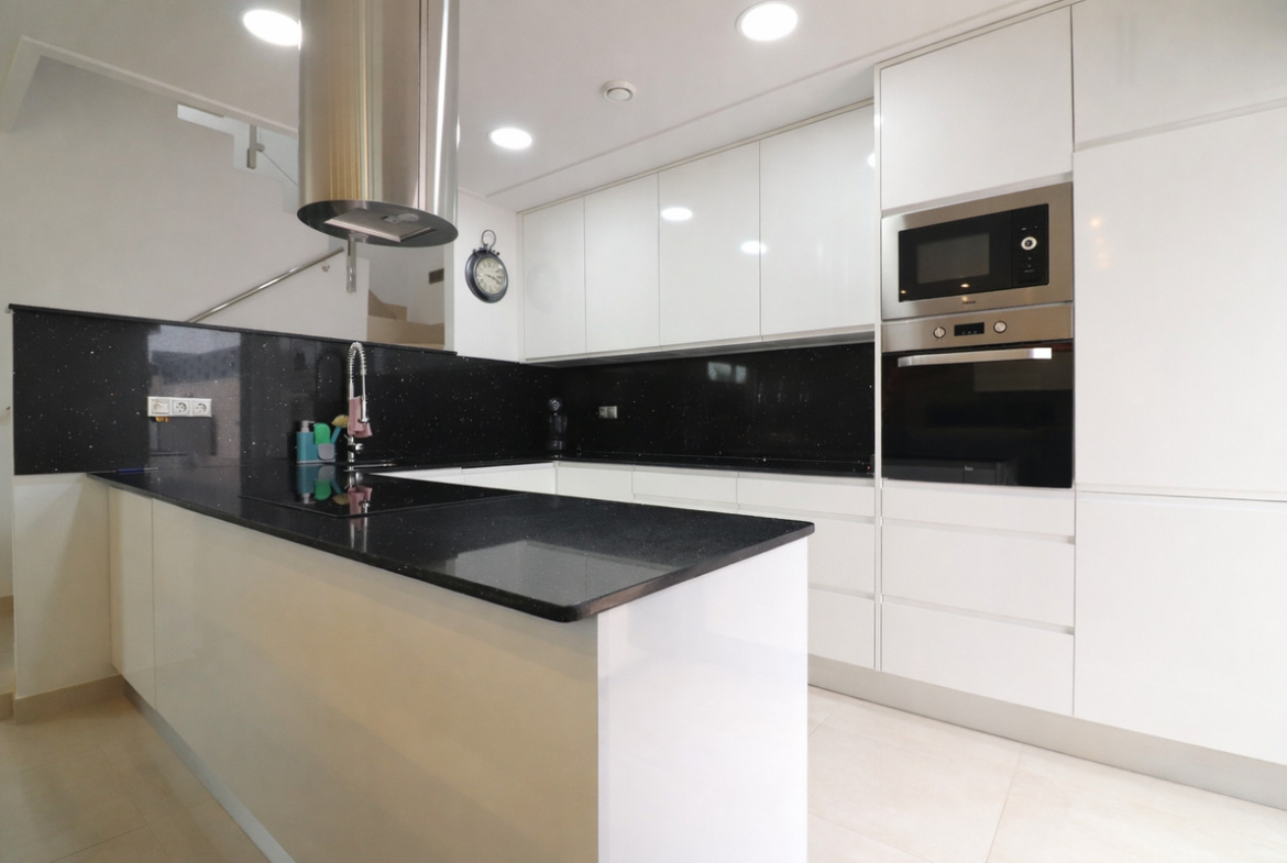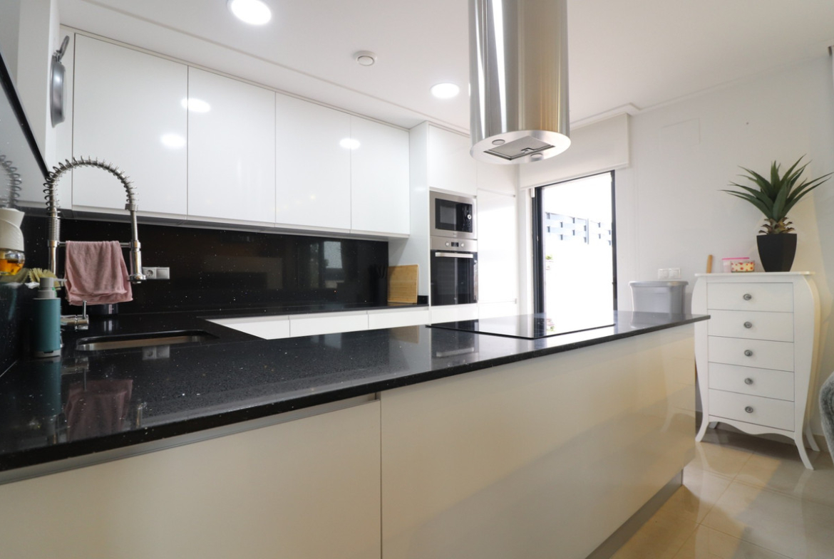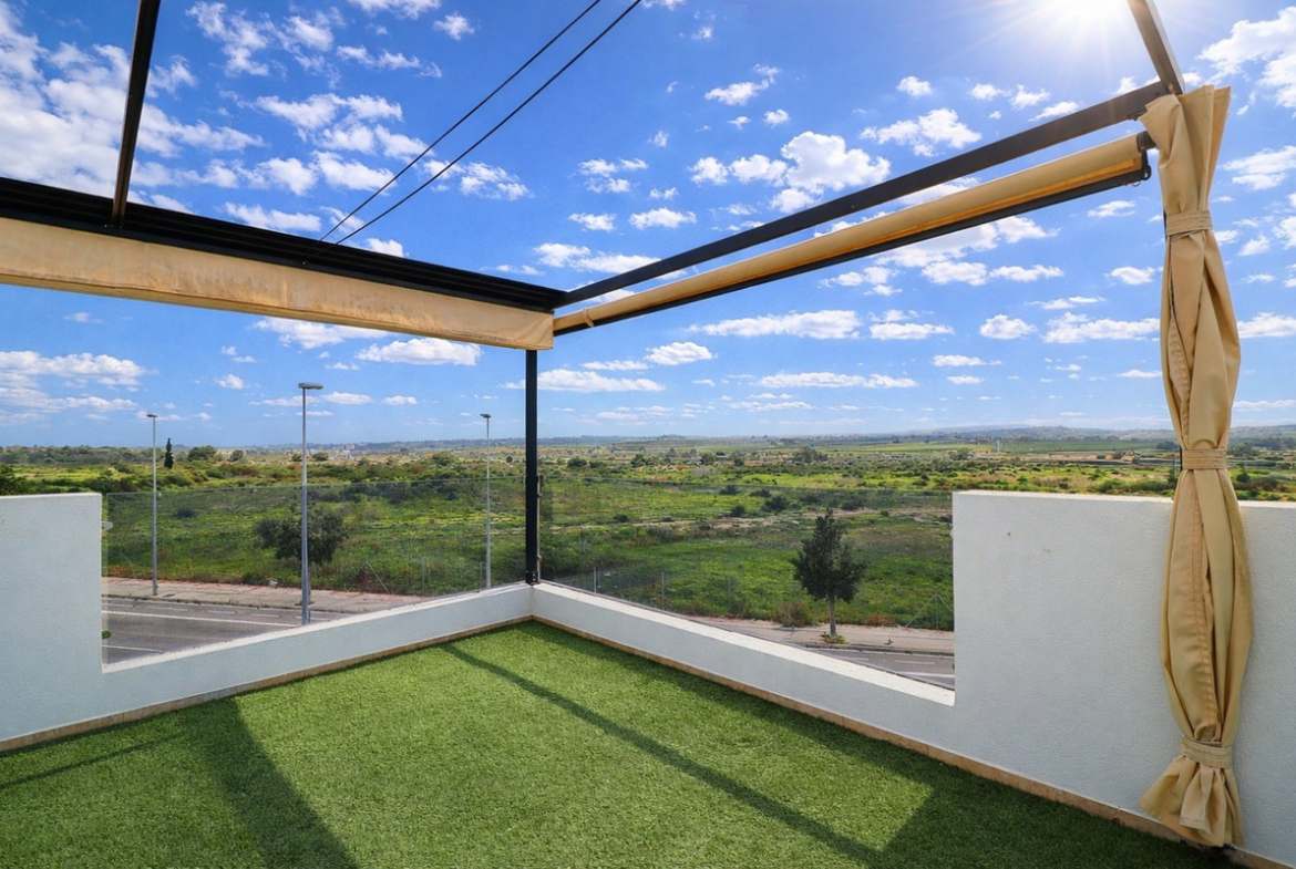 This Spectacular, Three Bedroom, Detached Villa in Benijofar, is located on the borders of this popular town, offering easy access to a wide range of amenities including restaurants, school, municipal sports ground, pharmacy, vets, medical centre, bank and more. A selection of quality restaurants, café bars and a small supermarket are within a 10 minute walk, whilst a couple of main chain supermarkets are just 5 minutes by car, including the neighbouring towns of Quesada and Rojales. La Marquesa Golf Course is just a 10 minute drive away, and a choice of beautiful beaches, including Guardamar, can be reached in approximately 15 minutes. Beautifully presented and set over two floors, the villa offers a 103m² build. The ground floor features a bright living area with stairs leading to the first floor and large double sliding glazed doors opening out to the tiled garden and private pool area. There is an extensive open plan modern white fitted kitchen with a door leading outside, a utility area, a double bedroom with access to a patio area and en suite shower room, plus a convenient cloakroom. The first floor comprises two further double bedrooms and a family shower room. External steps lead up to the impressive 45m² private solarium, where you can enjoy incredible open countryside and mountain views. Part of the solarium is laid with artificial grass and includes a metal framework with retractable sun blinds, creating a covered entertainment and dining area, along with a practical work space with electricity and storage. The garden is private and fully walled, featuring an easy maintenance tiled finish, off road parking, and a pergola with an insulated roof. The villa also boasts a private heated swimming pool, built-in wardrobes, ducted air conditioning, and solar panels serving the hot water system. A stunning modern home in a highly desirable area of the Costa Blanca South.