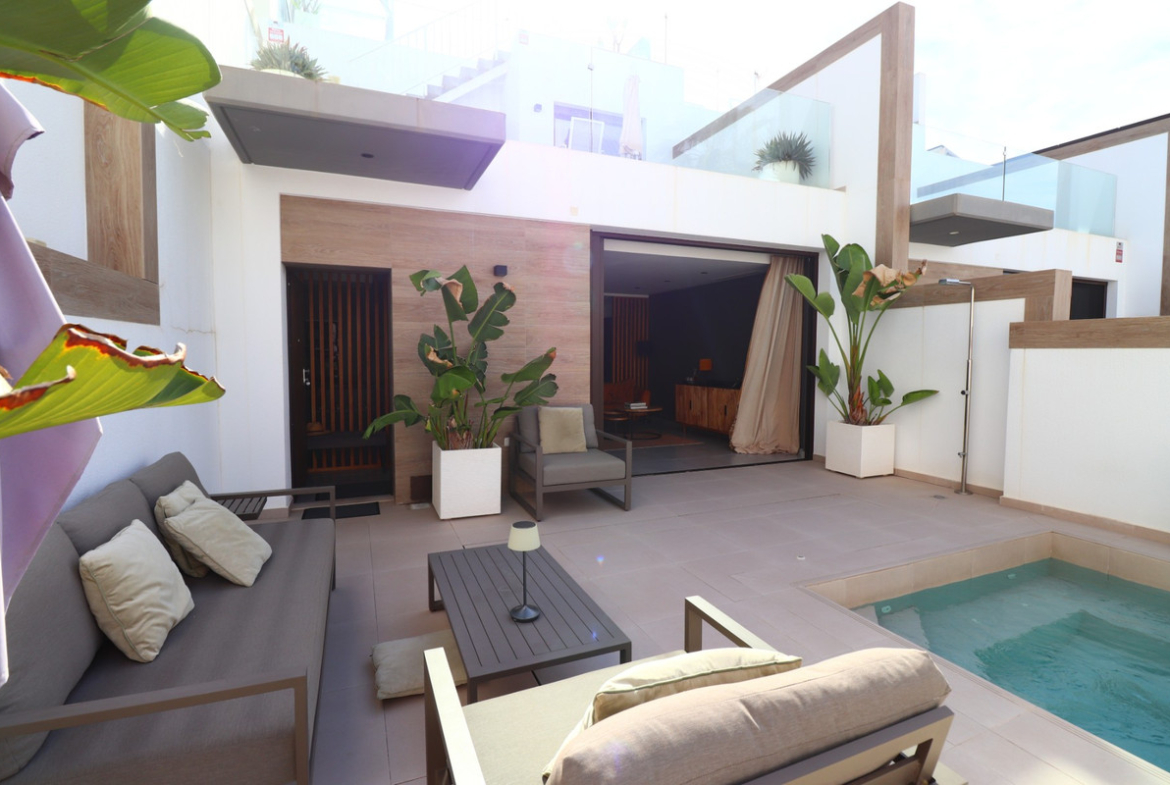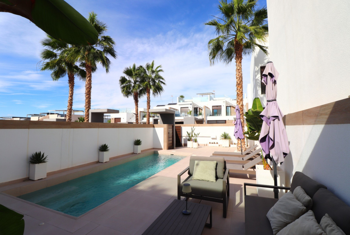 This Family Sized, Three Bedroom, Townhouse in Benijofar is located in this highly sought-after and well-established town, serviced by an abundance of amenities including a supermarket, café bars, restaurants, bank, pharmacy, vets, bakeries, school, sports ground, park and lake, medical centre, and modern commercial centres. La Marquesa Golf Course is just a 10-minute drive away, while the beautiful Costa Blanca South beaches are reachable in approximately 12 minutes. This outstanding home was built only 3 years ago, ideal for a family with its 171m² distributed over three levels and finished to a modern, high standard throughout. The main level offers a bright, open-plan living space with large sliding glazed doors leading out to the tiled pool area, along with a sleek, ultra-modern fitted kitchen, a shower room, and a double bedroom. On the first floor are two further double bedrooms, one of which benefits from its own terrace, together with a stylish family shower room. Internal stairs provide access to the under build, currently arranged as an additional lounge/sitting area with a double bed, featuring double sliding glazed doors and another glazed door to a private patio area. This level also includes a cloakroom and a utility/pump room. External stairs lead to the private solarium, complete with BBQ area — the perfect spot to relax and enjoy the open mountain and sunset views. The exterior of the property offers a tiled front garden with off-road parking and a private 6 x 3 swimming pool, ideal for family living or entertaining. A beautifully designed, modern home offering ducted air con throughout, electric blinds plus style, comfort, and convenience in the heart of the Costa Blanca South.
