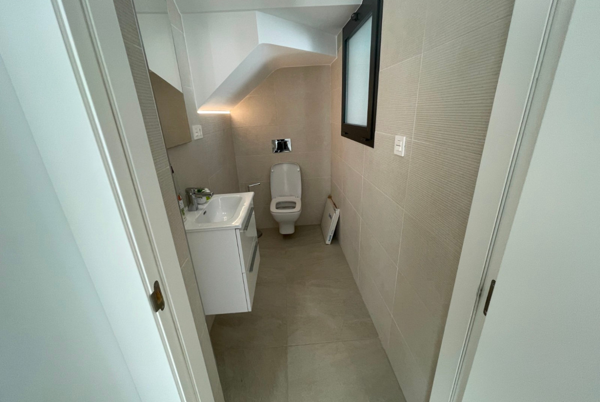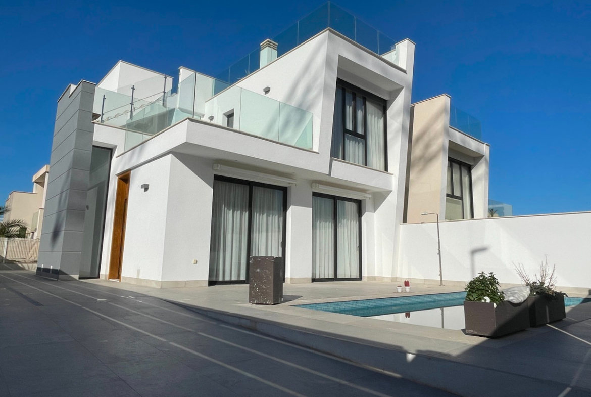 This spectacular independent villa, with 3 bedrooms and 3 bathrooms, is located in the charming town of Benijófar. Recently built, it is in perfect condition and ready to move in.On the main floor, the property features a master bedroom with an en-suite bathroom including a shower and two built-in wardrobes. There is also an additional guest toilet, a fully equipped kitchen with access to the laundry area, and a spacious living room with views of the exterior.Climbing elegant stairs with LED lighting, you reach the first floor, where there are two double bedrooms and a large bathroom with a shower. This floor also provides access to the terrace and solarium, offering stunning panoramic views of the mountains and surrounding countryside.The property includes a private pool, on-plot parking, and a basement ( not finish ) ideal for a wine cellar or storage room.Located just a few steps from the center of Benijófar, this villa is set in a charming area with all necessary services, making it perfect for year-round living or an ideal vacation retreat.