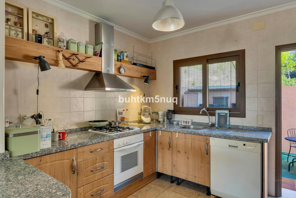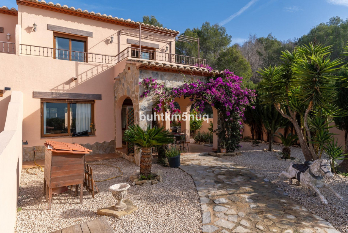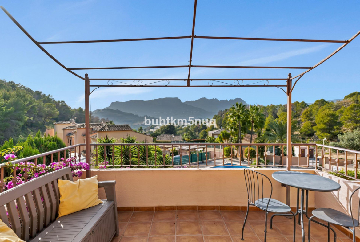 Sunny corner townhouse with three bedrooms, located in a quiet and green residential area in Calpe. The property is part of a small, well-maintained complex with a communal swimming pool and features its own pergola.~The house offers good and pleasant basic features, such as double glazing, an excellent orientation, and a comfortable, practical layout. Thanks to its favorable location, you can enjoy sunshine all day and beautiful mountain views, creating a relaxed and enjoyable living experience.~With approximately 90 m2 of living space, several terraces, and a private plot with a Mediterranean garden, this is a delightful home for those seeking peace, space, and comfort, just a short drive from the center and the beaches of Calpe.