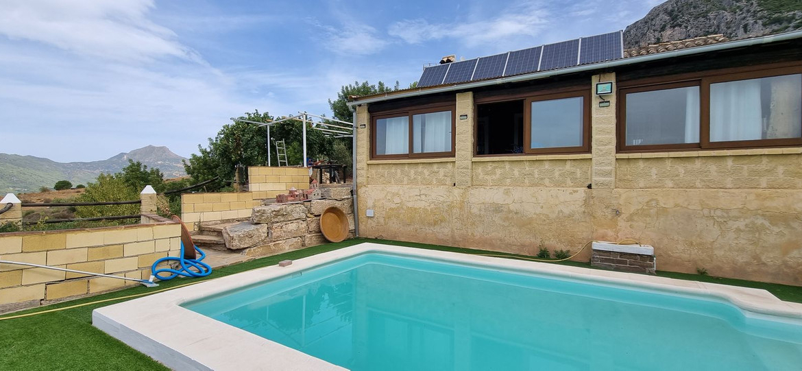 Great finca with three bedrooms, two bathrooms, lots of land and private pool. Just on the entrance of Casares village, no difficult roads, easy access, great quiet location and it has the most spectacular views that you will be able to find. There are 3 wells all with water, you get mountain view and a full open view west facing, absolutely gorgeous. The house is legal, but still part of a larger plot, so you could also acquire more land if this is what you wish. Electric not installed, but a point for electric has been paid for, though the current owner only uses electric from his 6 solarpanels and he has new battery system recently installed. Water he does use from the hidralia company, but there is enough water on the land from the wells if this is what you would like to use. Mainly a lot of trees, this land is dryer so not fantastic for fruit trees. Unique location, come and check this out.