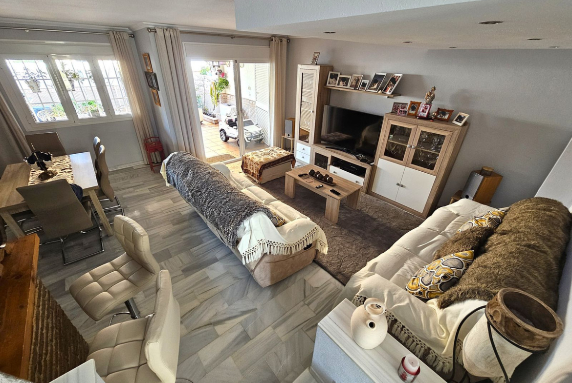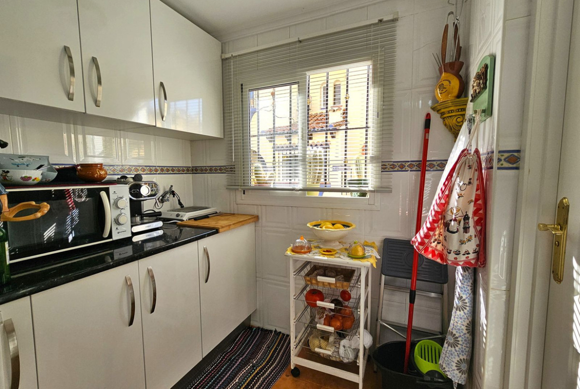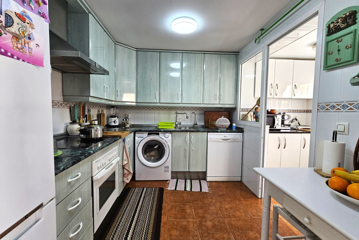 The property is accessed via an attractive Andalucian style porch with beautiful tiles and potted plants that opens up into the entrance hall with large cupboards. To the left is the fully fitted kitchen with separate utility room and guest bathroom. Down a few steps takes you into the large sitting room come dining room with a handy bar for those who like to entertain, and this leads straight out to the large terrace with beautiful Andalucian tiling and colourful plants. There is enough space on this terrace for family dining and a chill out area. A gate at the end of the terrace takes you to the communal gardens and swimming pool with direct access to the beach.