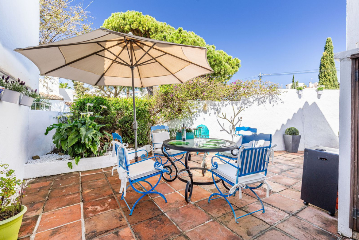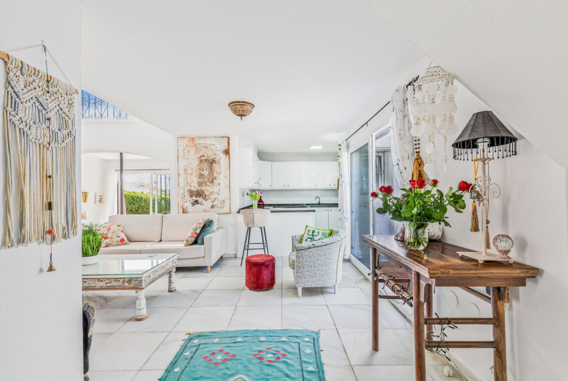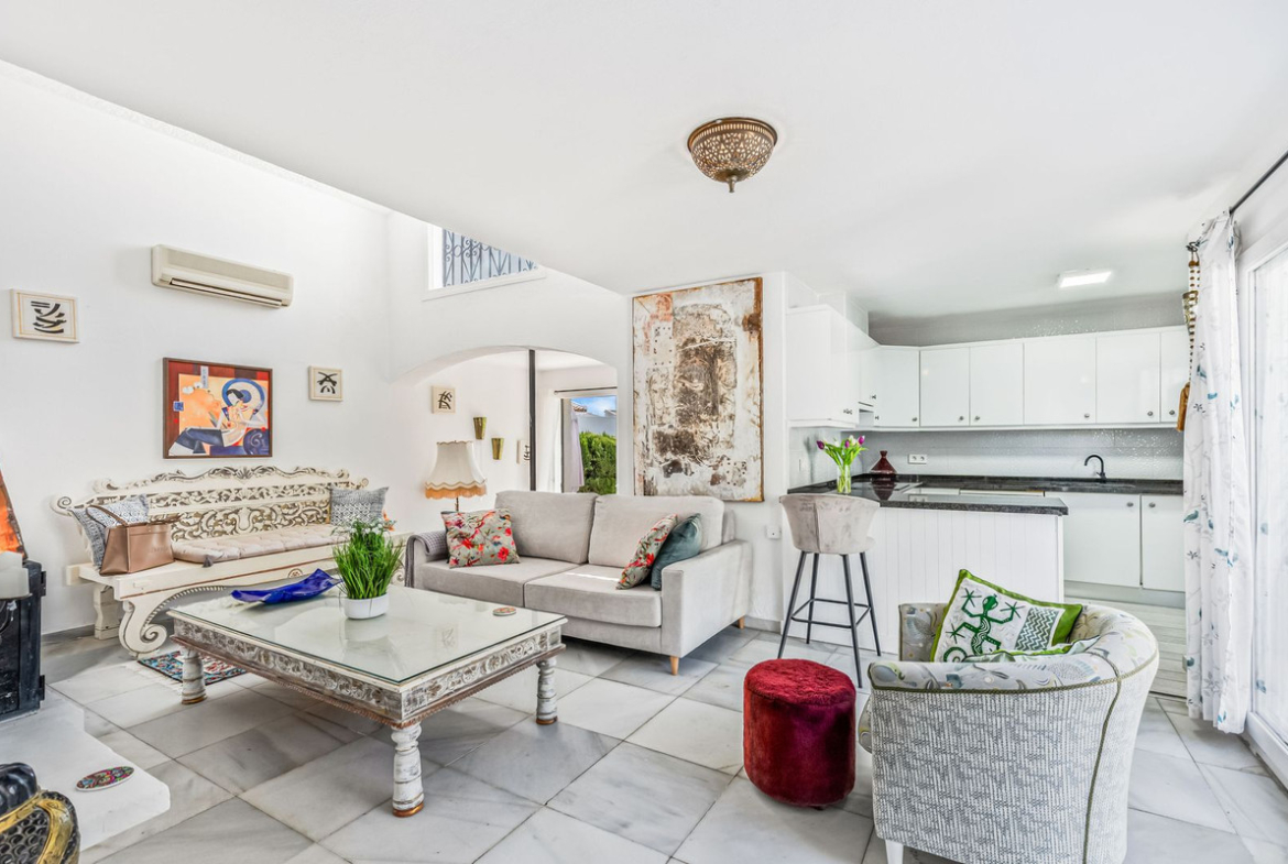 The open-plan kitchen flows seamlessly into a spacious living area, featuring a cozy fireplace and direct access to a large terrace—ideal for outdoor dining or entertaining. From here, the home extends into a generous private garden, perfect for enjoying the region’s year-round sunshine.