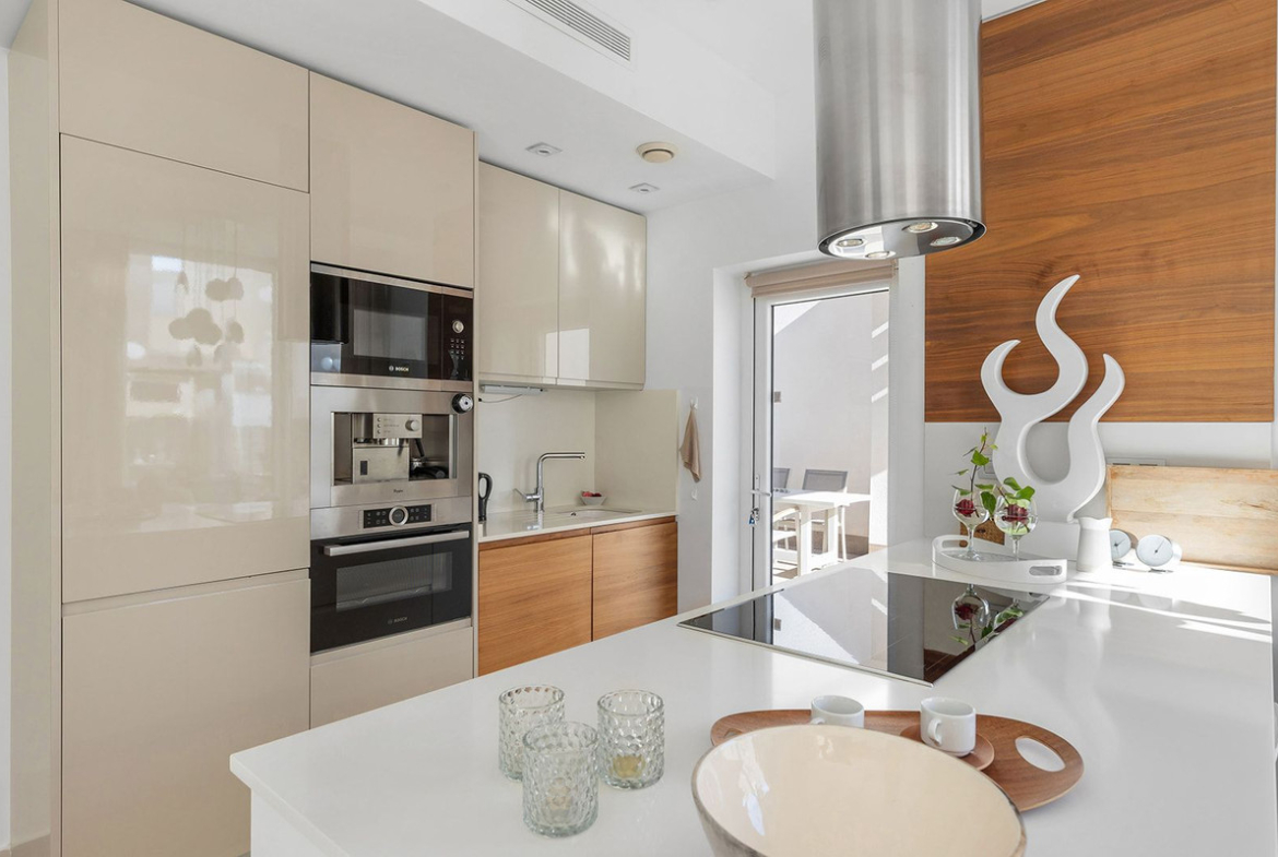 The main level offers an impressive sense of space thanks to the open-concept living and kitchen area, beautifully designed with premium materials and plenty of room for a full dining setup. The large windows enhances the natural light and creates an airy, sophisticated atmosphere. On this level you will also find one of the bedrooms and a stylish bathroom.