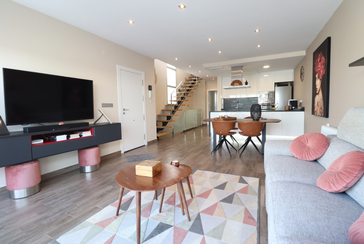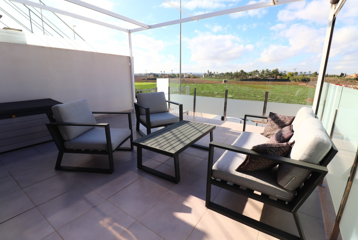 This modern South Facing, Three Bedroom, Semi-detached Villa in Daya Vieja is located on the edge of this charming and peaceful Spanish village, just a 5-minute walk to local bars and restaurants and only a 15-minute drive to the beautiful beaches of the Costa Blanca South. The property enjoys lovely open views across the mountains, countryside and surrounding citrus groves, offering an ideal balance between modern living and a relaxed rural setting. Built to a high modern standard, this stylish home boasts a 133m² build on a 179m² private plot. The ground floor comprises a bright and spacious lounge/dining room with air conditioning and double sliding glazed doors that open directly onto the tiled garden, finished with artificial grass and featuring a private swimming pool and a useful storage room. The open plan fully fitted kitchen is modern and well-designed, perfect for family living or entertaining. There are three double bedrooms, all with air conditioning. The master bedroom is located on the ground floor and benefits from a walk-in wardrobe and en-suite shower room. Upstairs, you’ll find two further double bedrooms with fitted wardrobes; one of these has access to a private terrace, which can also be reached externally. In total, there are two modern shower rooms — one on each floor. Additional features include mosquito nets throughout, electric blinds and a versatile under build that can be used as a games or entertainment area, extra bedroom, lounge or even an office space. A beautifully presented, key-ready villa offering modern comfort, stunning views and a peaceful location — perfect for full-time living or a luxurious holiday retreat on the Costa Blanca South.