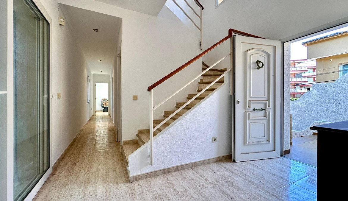 Detached villa with a beautiful garden next to the sea in Las Rotas, Denia, only 100 metres from the cozy beaches and with a perfect southeast orientation.This property has been kept in excellent condition thanks to the fact that it has had only one owner. Its functional and cosy distribution is organised on two floors and a basement.On the main floor, upon entering, we are welcomed by a spacious and bright hall that leads to an elegant living-dining room with fireplace, ideal for relaxing, with direct access to a covered terrace from which you can enjoy the views to the garden. The independent large kitchen has a window to living area and it has a separate laundry room. Furthermore, this floor houses two large bedrooms and a complete bathroom.The first floor is a private retreat where is the master bedroom with an en suite bathroom and access to two terraces offering sea and mountain views.The basement has a large storage room and a garage with capacity for 3-4 vehicles, with direct access to the property, offering comfort and security.Additional features of this property include air conditioning and fitted wardrobes in all bedrooms.Its privileged location, just 100 metres from the beaches and surrounded by a wide range of restaurants and bars on the seafront, makes this villa the perfect choice for those looking for peace and quiet with all the comforts.