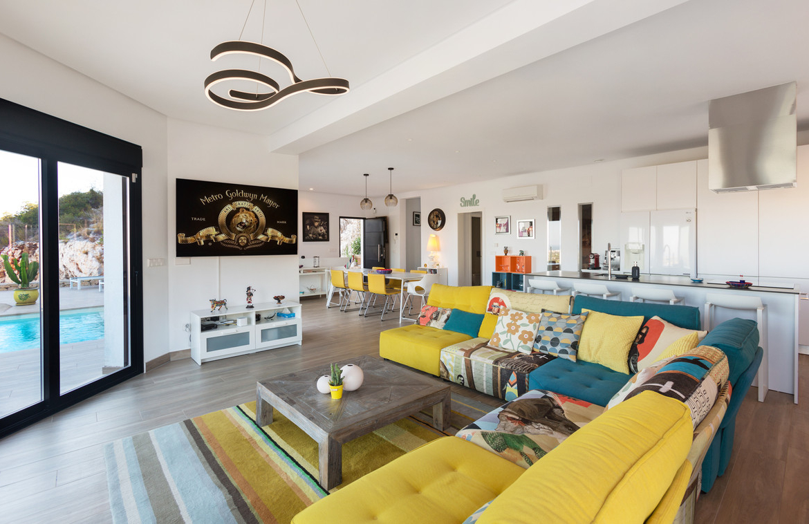 Fantastic recently built luxury villa with panoramic sea views, 3 bedrooms, double parking, an open kitchen, a living room, and a dining room at pool level.