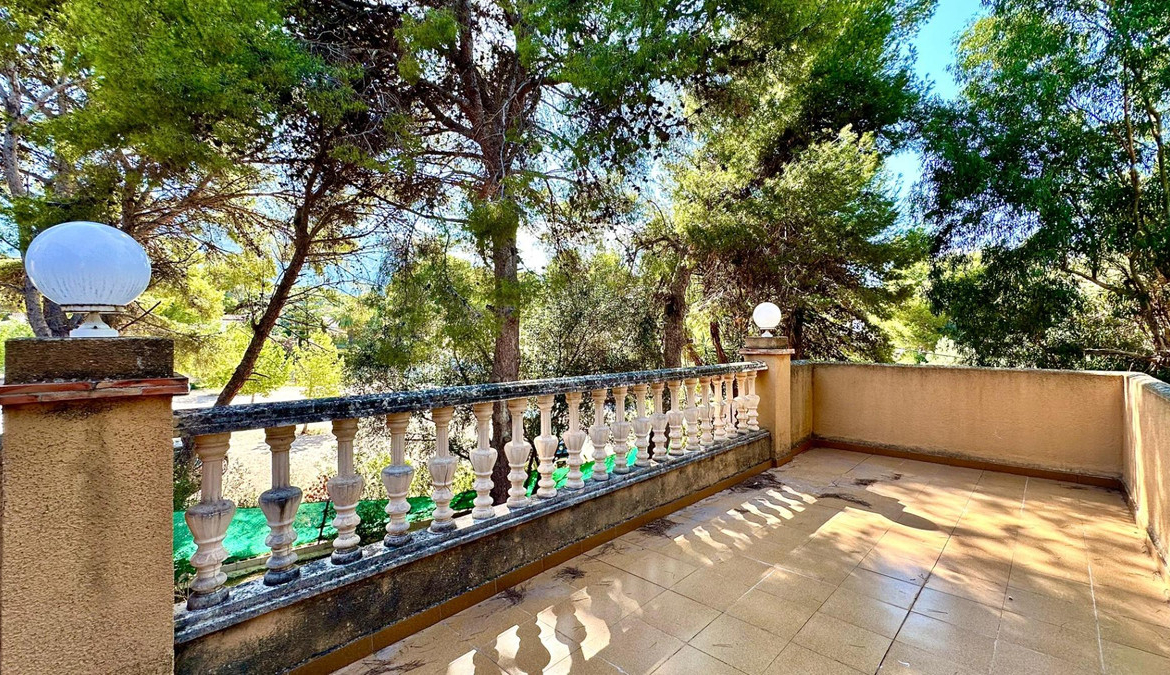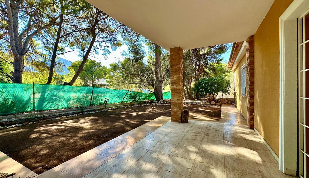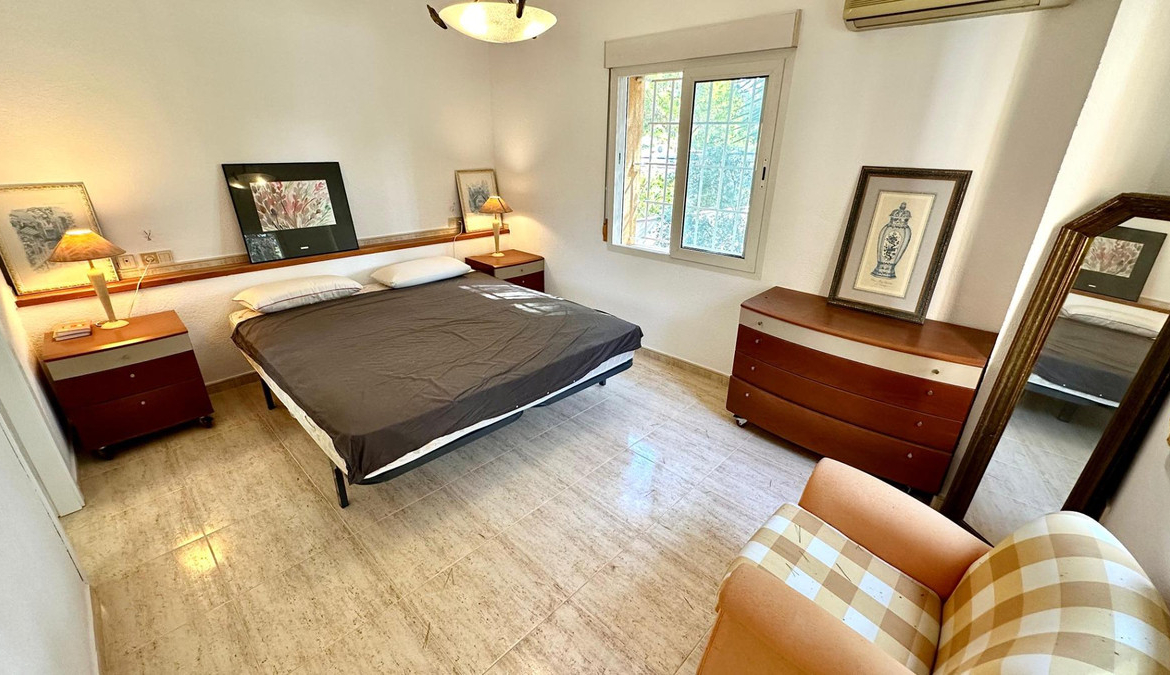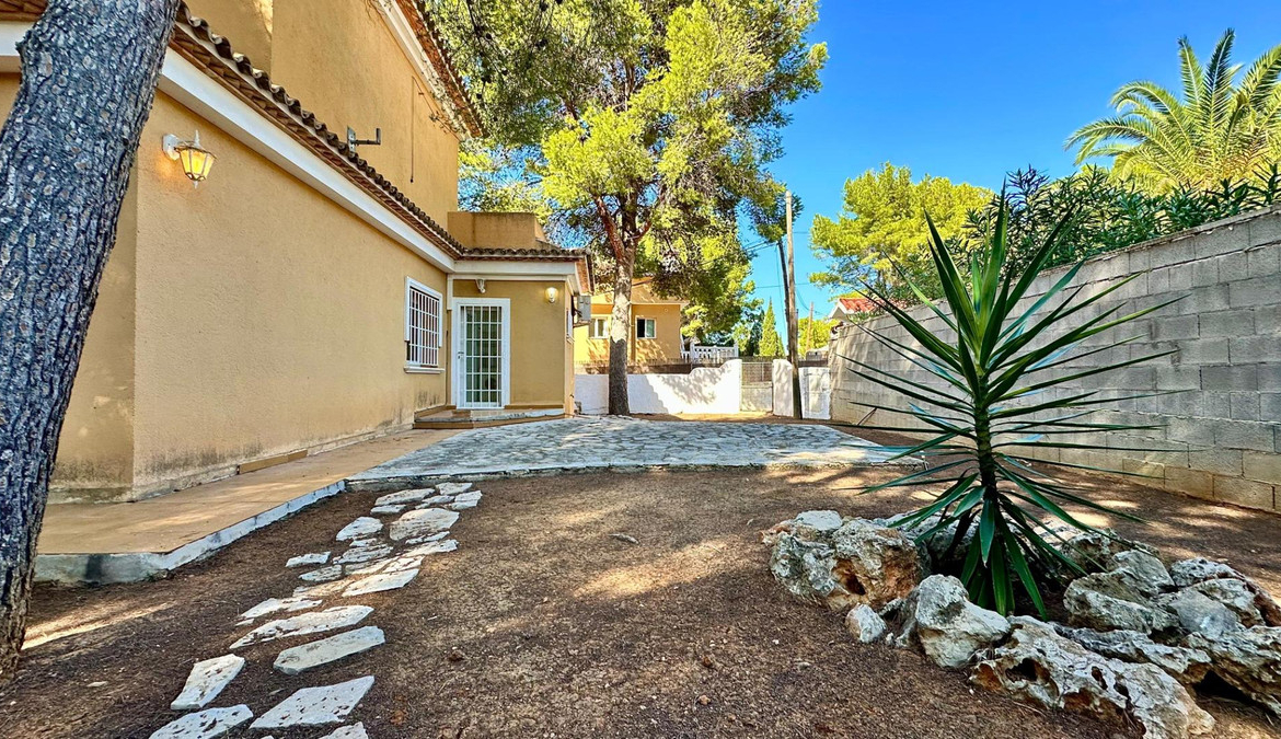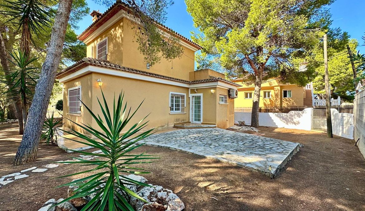 Detached villa with a beautiful garden next to the sea in Las Rotas, Denia, only 100 metres from the cozy beaches and with a perfect southeast orientation.This property has been kept in excellent condition thanks to the fact that it has had only one owner. Its functional and cosy distribution is organised on two floors and a basement.On the main floor, upon entering, we are welcomed by a spacious and bright hall that leads to an elegant living-dining room with fireplace, ideal for relaxing, with direct access to a covered terrace from which you can enjoy the views to the garden. The independent large kitchen has a window to living area and it has a separate laundry room. Furthermore, this floor houses two large bedrooms and a complete bathroom.The first floor is a private retreat where is the master bedroom with an en suite bathroom and access to two terraces offering sea and mountain views.The basement has a large storage room and a garage with capacity for 3-4 vehicles, with direct access to the property, offering comfort and security.Additional features of this property include air conditioning and fitted wardrobes in all bedrooms.Its privileged location, just 100 metres from the beaches and surrounded by a wide range of restaurants and bars on the seafront, makes this villa the perfect choice for those looking for peace and quiet with all the comforts.