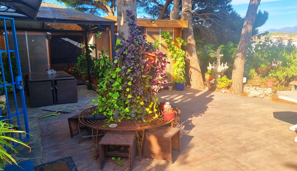 • Private 330 m² plot with artificial grass, garden, barbecue, ornamental fountain, and decorative lighting.
