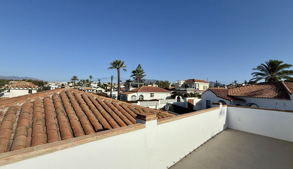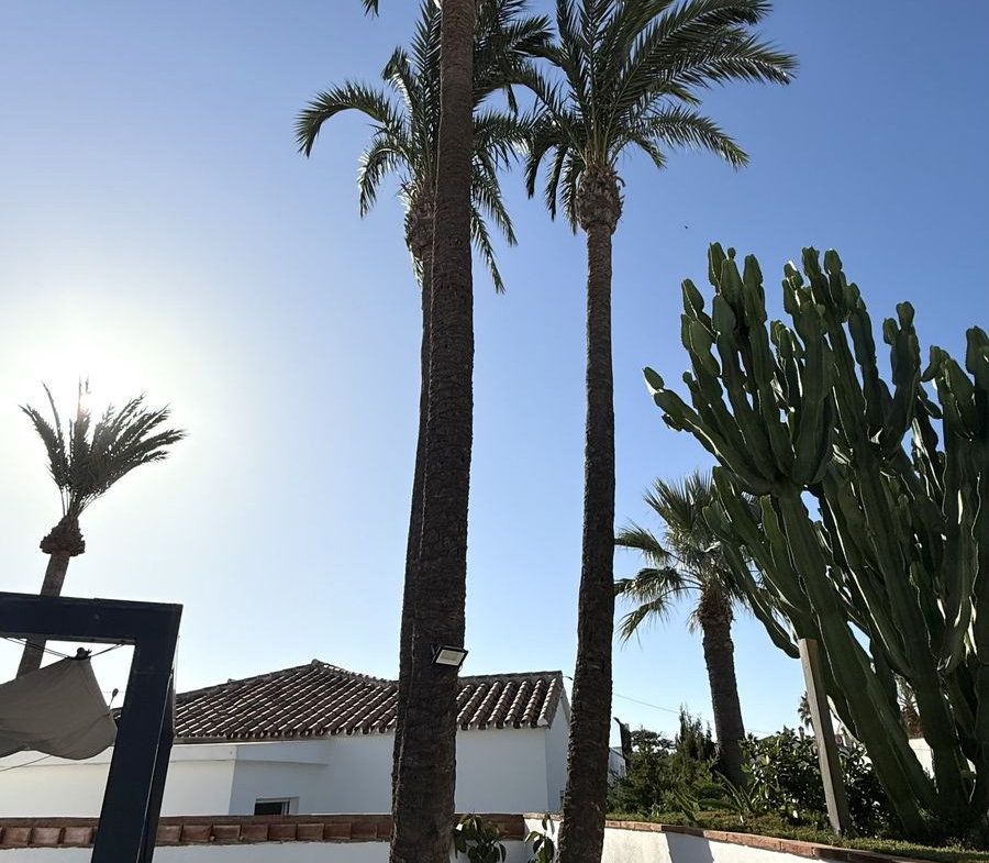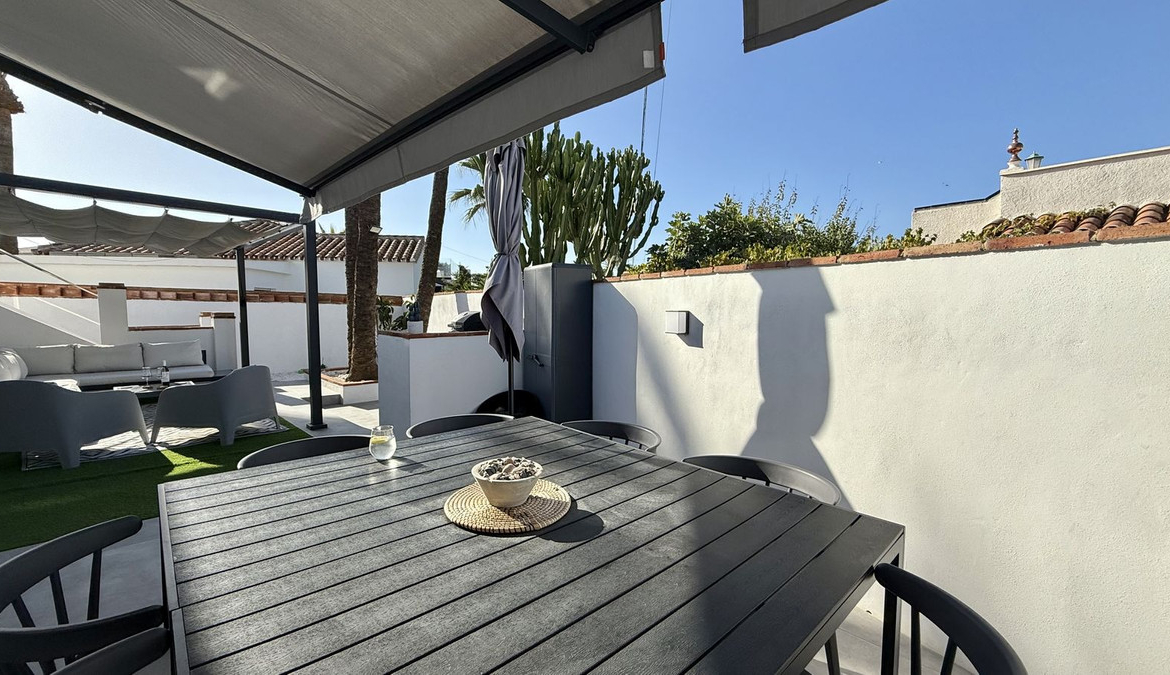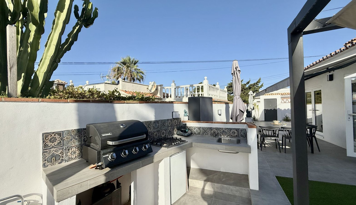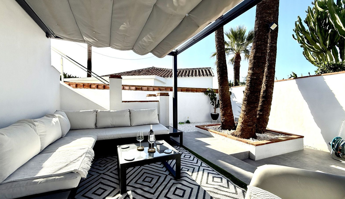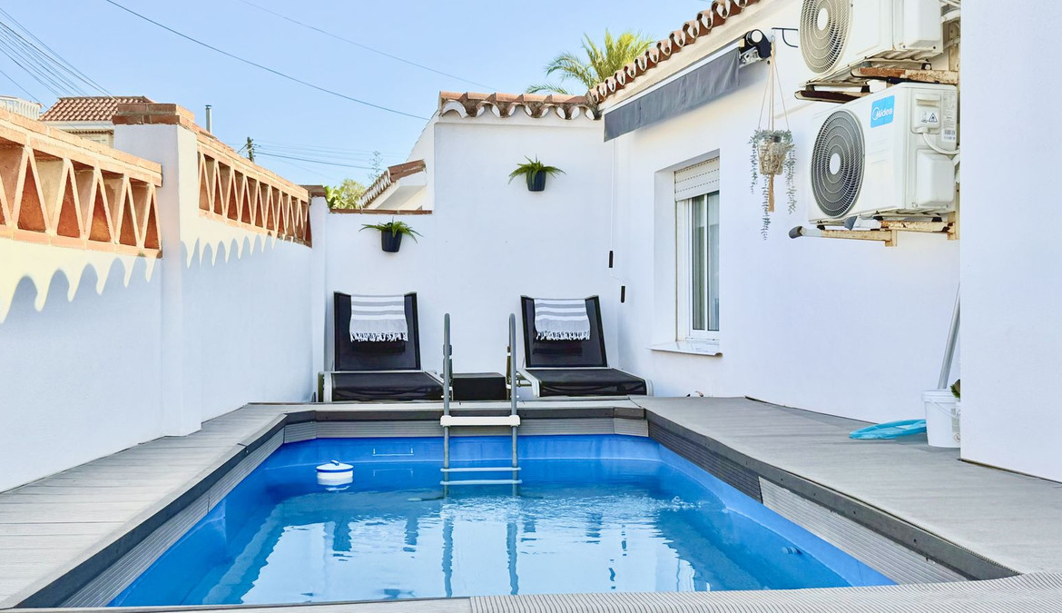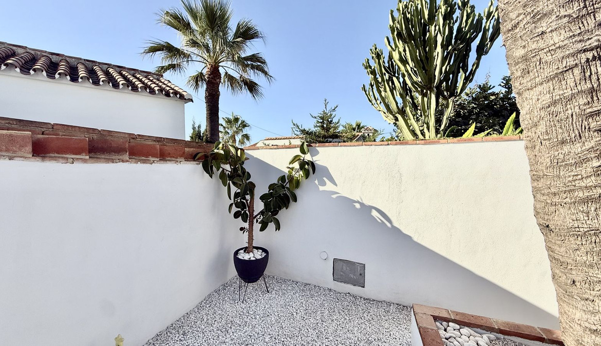 Set on a nearly 300 m² private garden plot, the home is just a short walk to the picturesque El Faro beach,