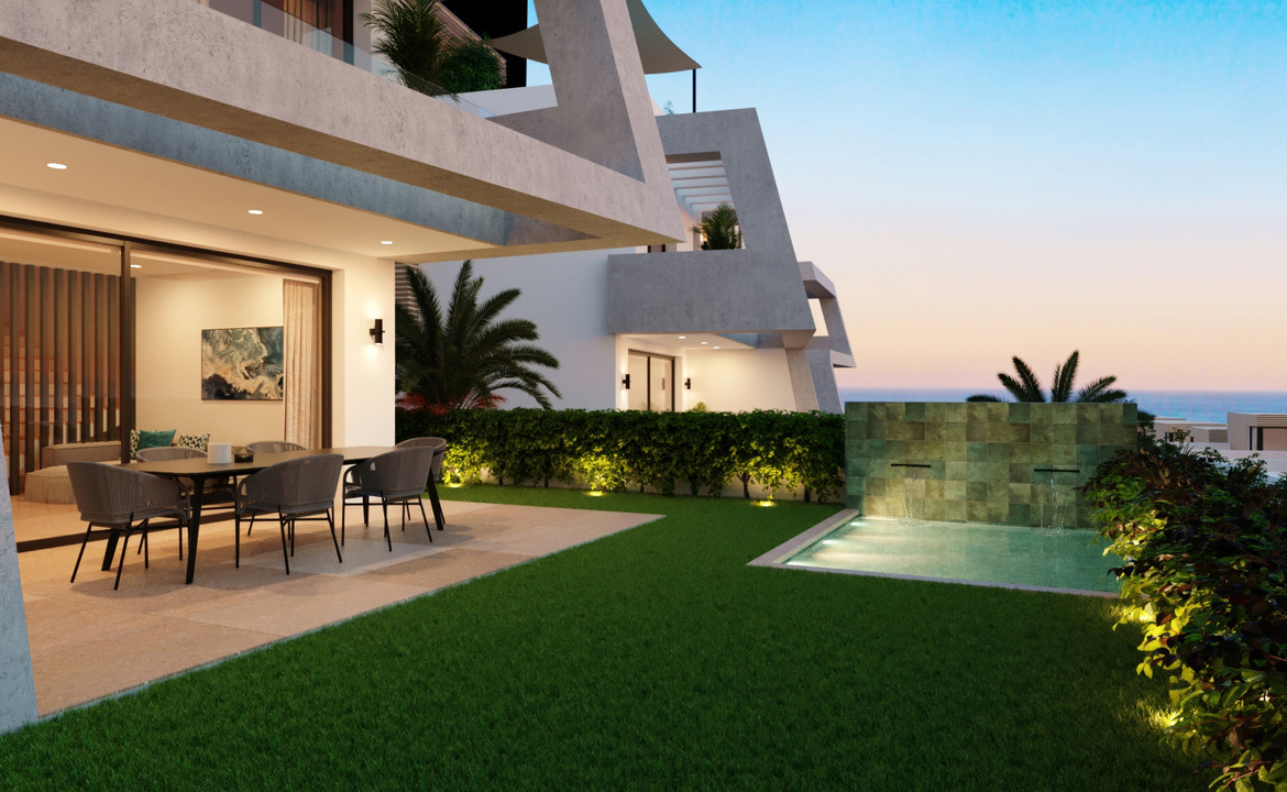 The interiors are designed with comfort and functionality in mind. Bedrooms use soft materials and warm tones, with a master suite that includes an en-suite bathroom, dressing room, and private terrace. Two additional bedrooms feature built-in wardrobes and share a full bathroom with neutral, modern finishes. Living areas include an open-plan kitchen fitted with Siemens appliances (with alternative ranges available), a guest toilet, and a generous living-dining space with large windows opening directly onto the terrace and garden.