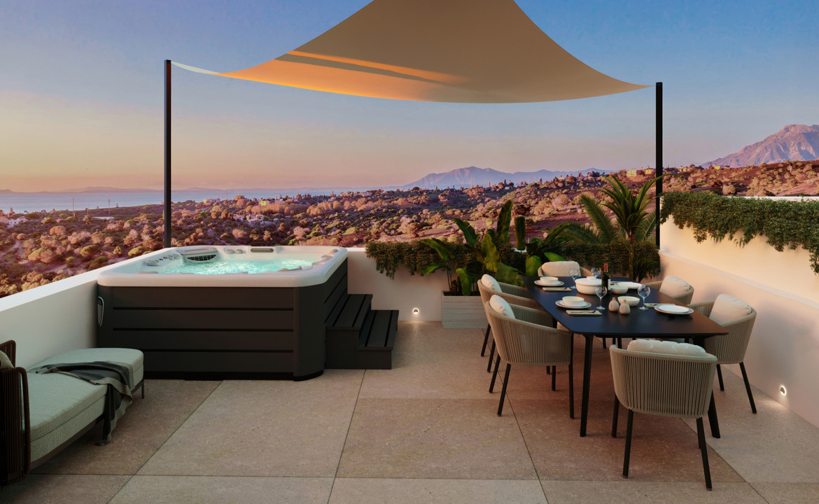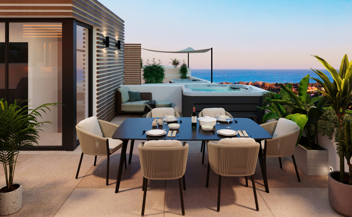 Each townhome is distributed over four levels and features a private glass-door elevator providing direct access to all floors. Spacious terraces include the option of a jacuzzi, outdoor kitchen with barbecue, and dedicated areas for outdoor dining and relaxation, creating seamless indoor–outdoor living.