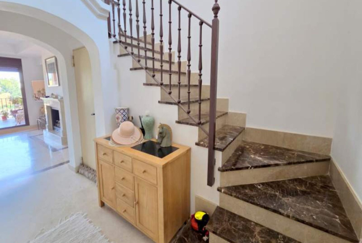 ***Elegant Boutique Community Living*** Ibergolf is an exclusive and intimate residential enclave nestled within the serene surroundings of Azata Golf, Estepona. This beautifully appointed property offers exceptional accommodation throughout and is the perfect blend of sophistication, comfort, and Andalusian charm. From the moment you enter, you’re greeted by stylish interiors featuring marble flooring, ornate staircases, and elegant decorative finishes that exude timeless quality. The gated community is impeccably maintained, with landscaped gardens, meandering pathways, and a sparkling communal pool – ideal for relaxing or entertaining. The entrance hall opens to a fully equipped kitchen and dining area, enjoying delightful views over the front gardens. A guest bathroom is conveniently located along the hallway, alongside internal access to the private garage and basement storage. The living area is warm and inviting, with a feature fireplace and oversized patio doors leading out to a spacious terrace – the perfect spot to enjoy breathtaking views of the sea and golf course. Upstairs, you'll find three generously sized bedrooms, all with ample wardrobe space. The main bedroom features a luxurious en-suite bathroom and a Juliette balcony, while the second and third bedrooms both enjoy charming balconettes and share a stylish family bathroom. Offered fully furnished, this property includes a private garage and additional storage area, accessible both internally and externally – making it as practical as it is beautiful. The property also has a tourist licence for those looking to achieve a rental yield.