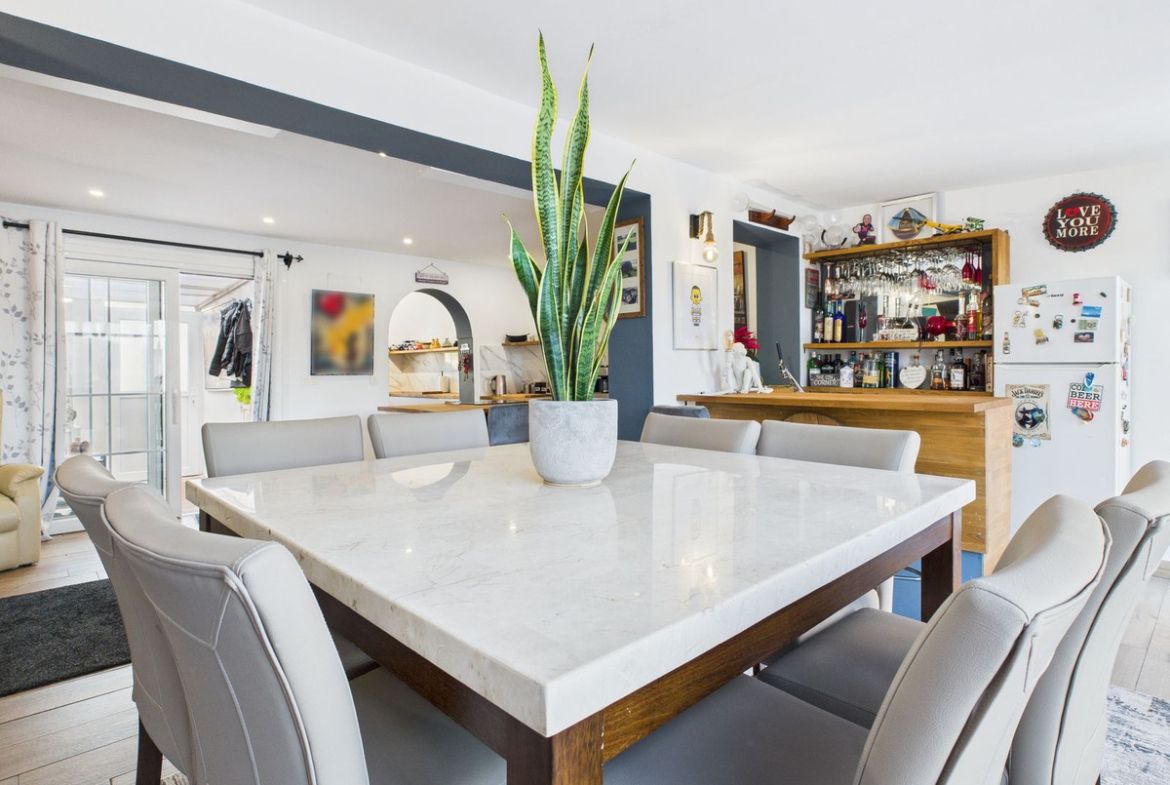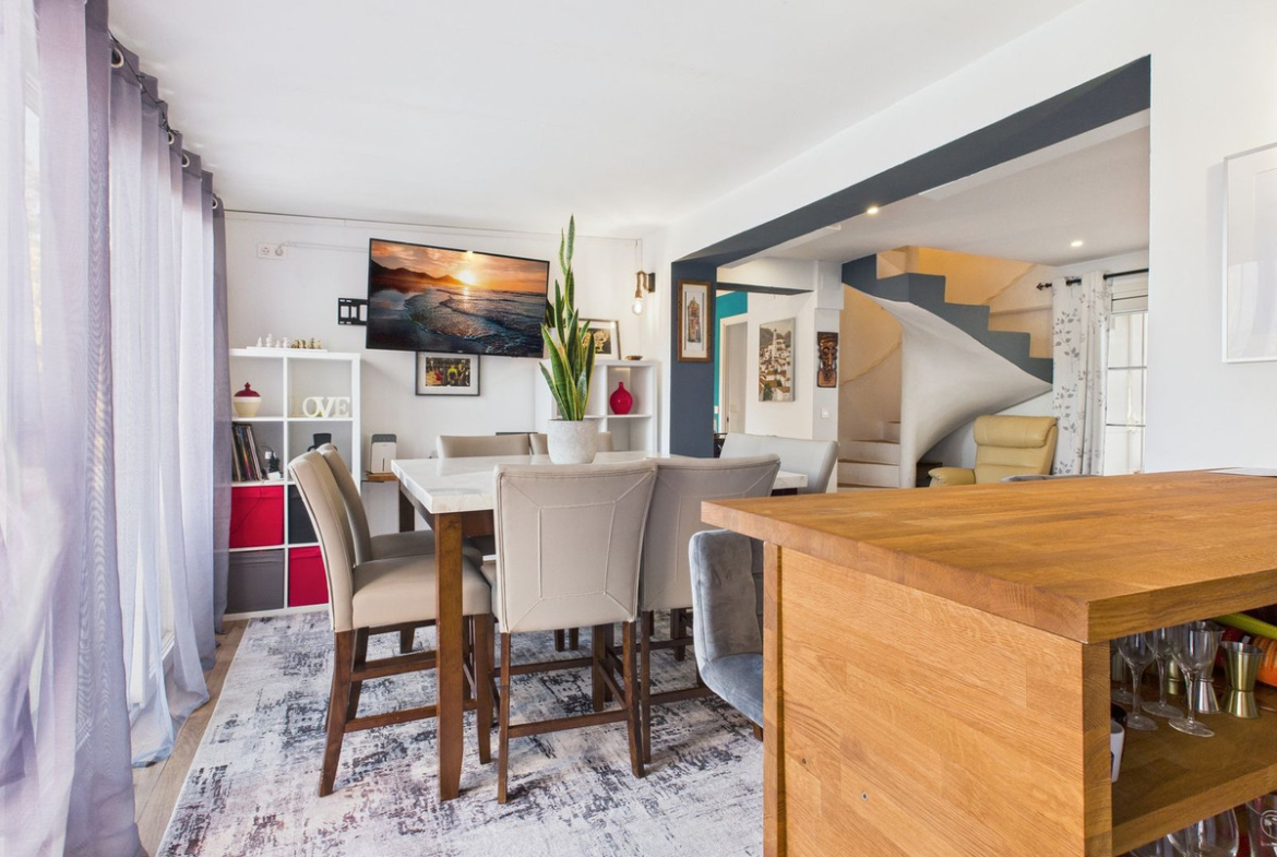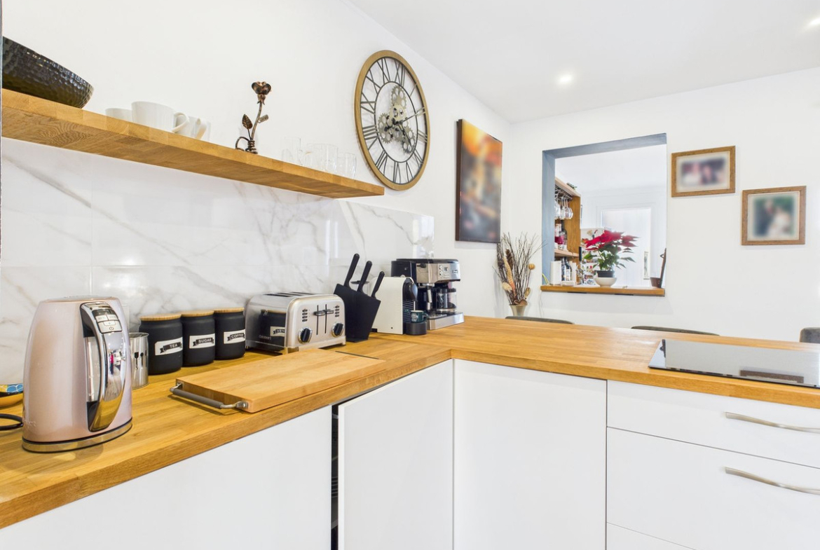 The kitchen has been finished with solid oak worktops, including a stylish bar, adding warmth and character to the home. Air conditioning provides year-round comfort.