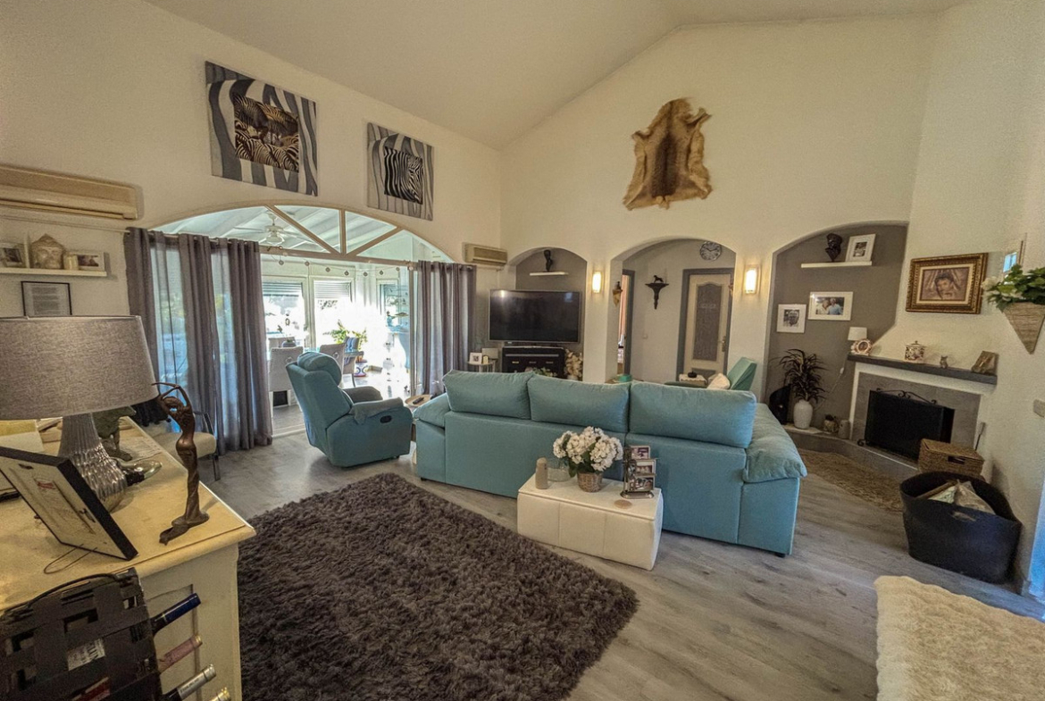 The house is built on one level, providing comfort and practicality throughout. The entrance hall leads to a large living room with high ceilings, bright and inviting, with direct access to a covered terrace overlooking the garden and swimming pool. Adjacent to the living room is a spacious, fully equipped kitchen, ideal for everyday living.
