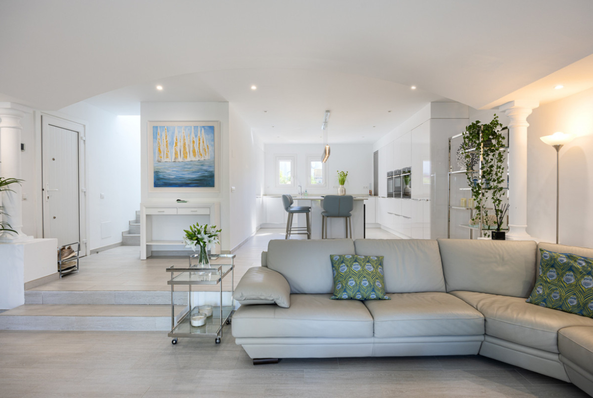 Spread over two levels, the home is bathed in natural light, thanks to its south-west orientation, ensuring bright, airy interiors throughout the day. The expansive solarium offers impressive sea views, perfect for relaxing or entertaining. The property includes a private garden facing southwest, ideal for enjoying the Mediterranean climate.