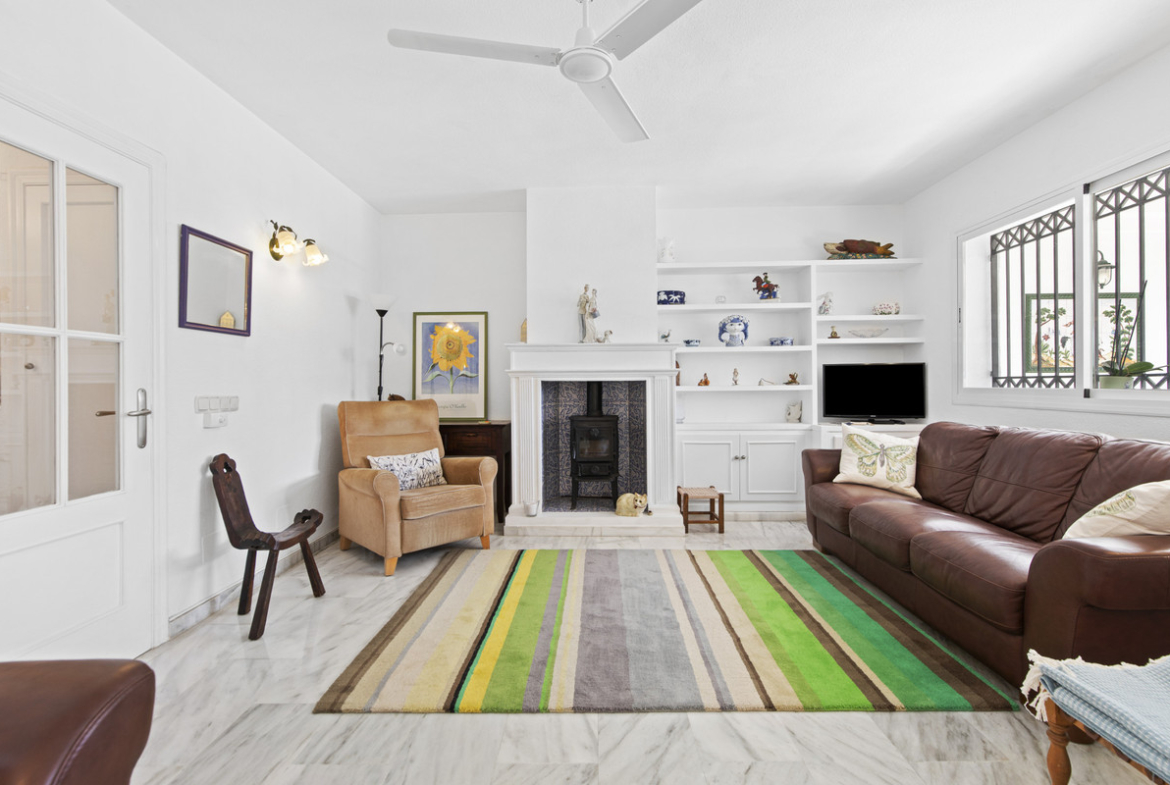 This charming two-level property offers spacious and versatile accommodation, finished to a high standard and filled with natural light throughout. The large living room is a welcoming focal point, featuring marble flooring, a beamed ceiling, a wood-burning stove and overhead fans, creating a comfortable yet character-filled space ideal for year-round living.