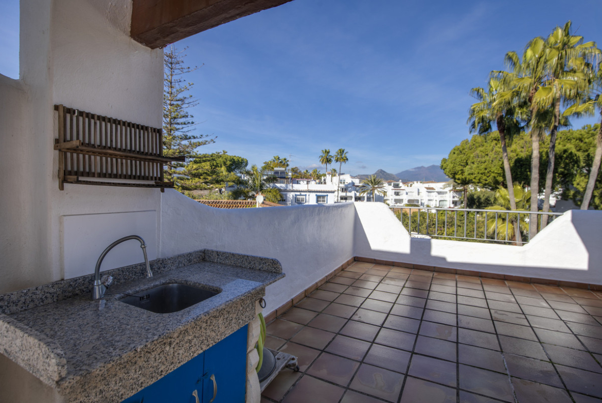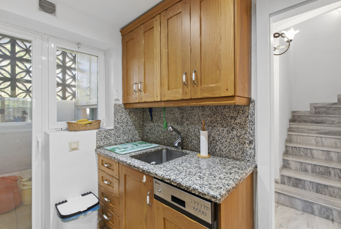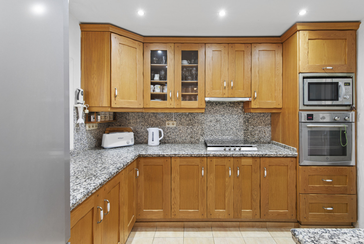 Outdoor spaces are a standout feature of this property. The garden is laid with tiled and gravelled areas, complemented by mature shrubs, high hedges for privacy, a garden shed and an attractive mosaic feature. There is a covered terrace, as well as a ground-floor terrace enclosed with glass curtains, ideal for all-season use. The solarium offers partial cover, a built-in low-level seating area and a BBQ space, perfect for entertaining while enjoying sea and garden views.