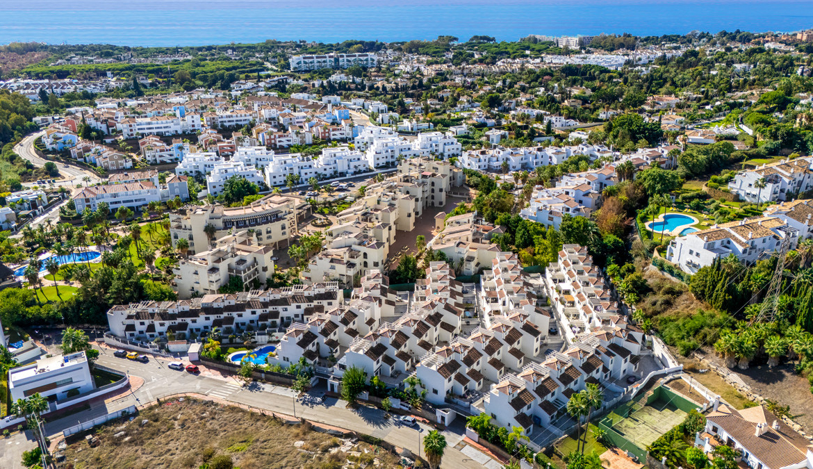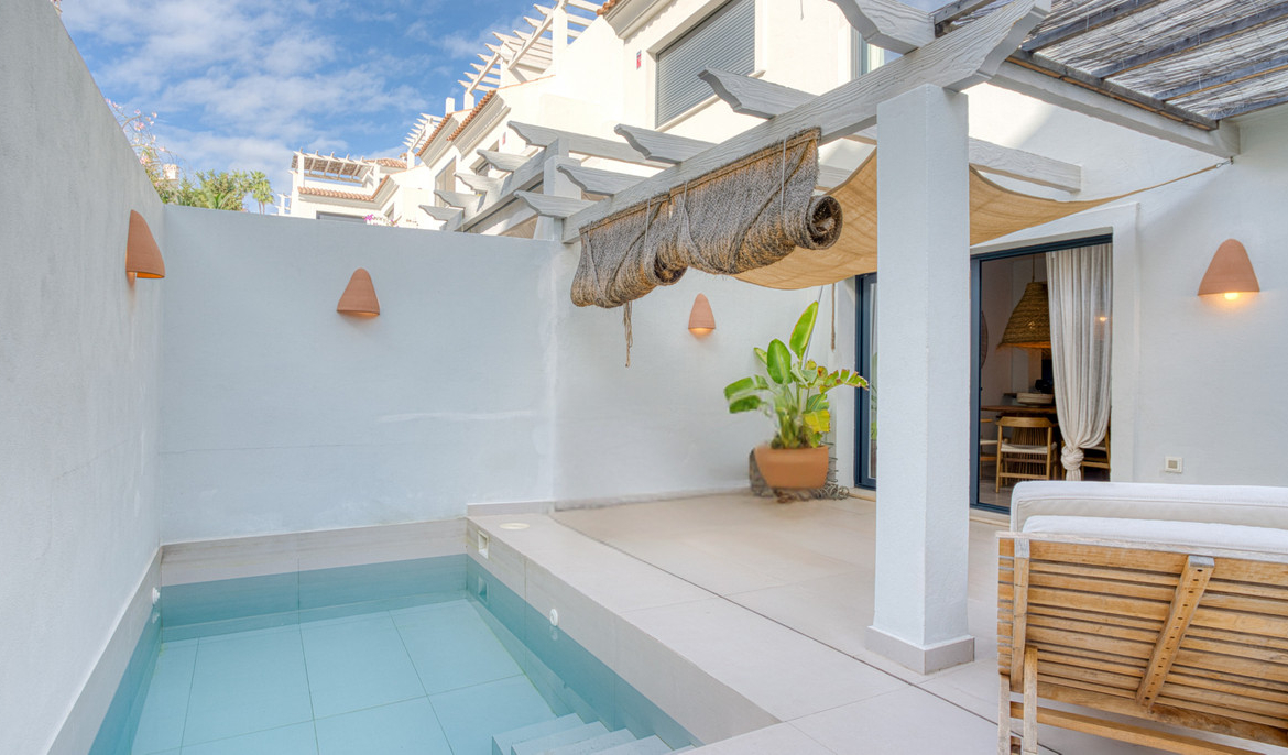 Elegant, three bedroom townhouse located in the gated community of Agra Residencial, a charming Mediterranean-style complex of 47 spacious homes situated beside El Campanario Golf & Country Club, in the heart of Estepona’s prestigious Golden Triangle. Ready to move in, this property showcases bright, open interiors with quality finishes, including ceramic flooring, fitted wardrobes, modern bathrooms with glass shower screens, and a fully furnished kitchen. Designed for comfortable living, it features generous terraces, a private solarium, and a private pool—perfect for enjoying the Costa del Sol lifestyle. Additional highlights include hot and cold air conditioning, two underground parking spaces, and access to beautifully landscaped communal gardens and a swimming pool within this secure, gated community.
