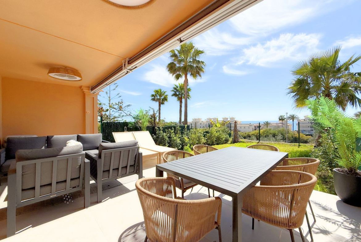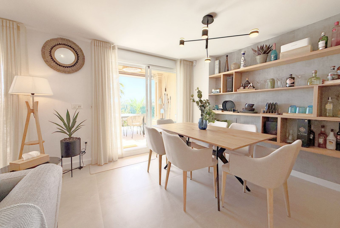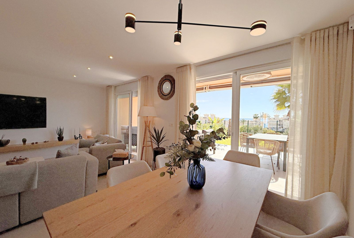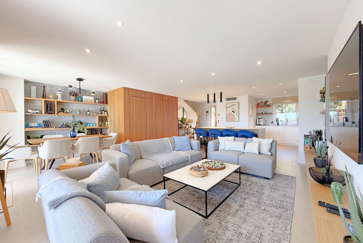 This fantastic property, recently renovated with high quality materials, is distributed over 2 floors and solarium. South facing, it enjoys natural light all day long. As you enter the property you are received by a bright and spacious living room with an integrated kitchen. Through large windows, they connect to a covered terrace with awnings and fans, and to the private garden of 60 m2, with sea views.