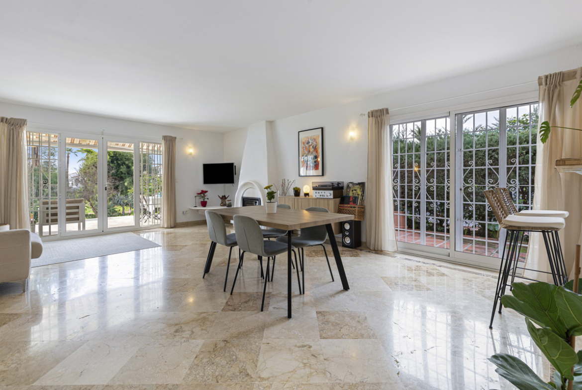 A welcoming entrance hall leads into a spacious lounge and dining area featuring a fireplace and double doors opening onto a recently renovated patio. From here, the property enjoys views over the large south/south-west facing garden, with partial sea views visible from the ground floor terrace and from upstairs bedroom..