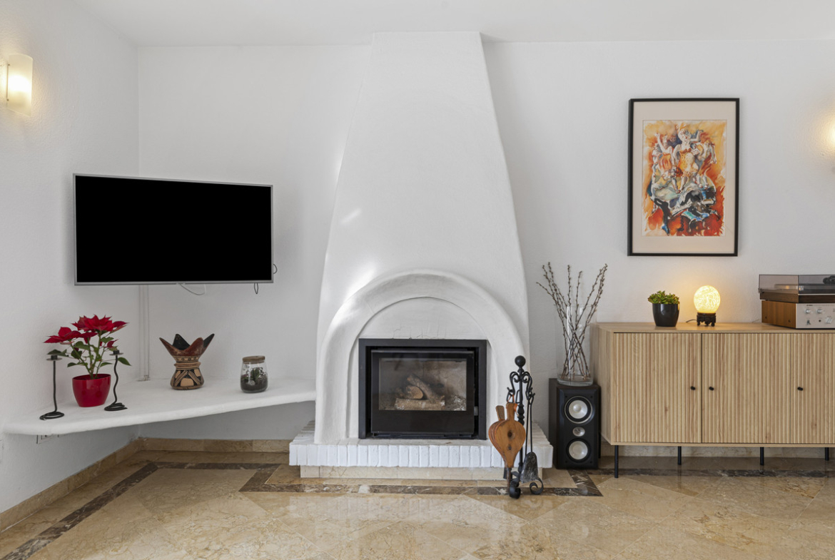 A marble staircase leads to the upper floor, where high vaulted ceilings enhance the sense of space. The master bedroom is well-proportioned and features an en-suite bathroom. An unusually wide hallway leads to two additional bedrooms and a family bathroom.