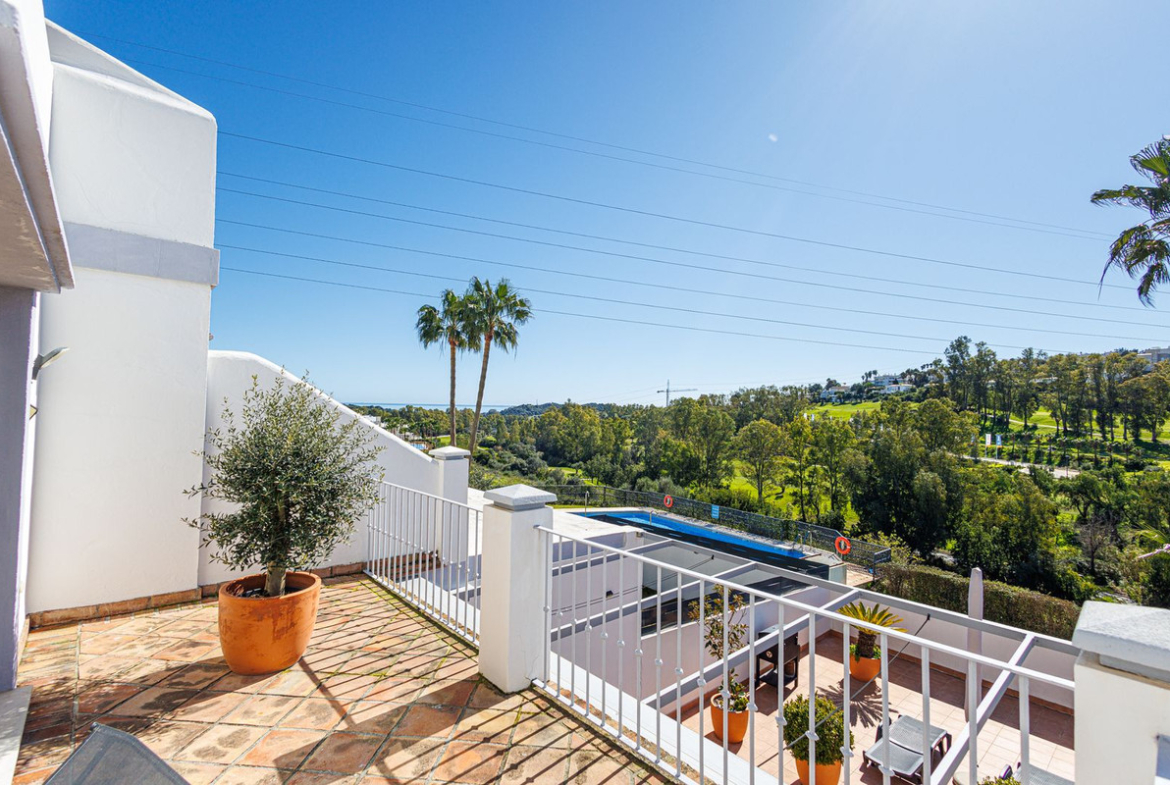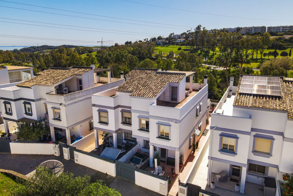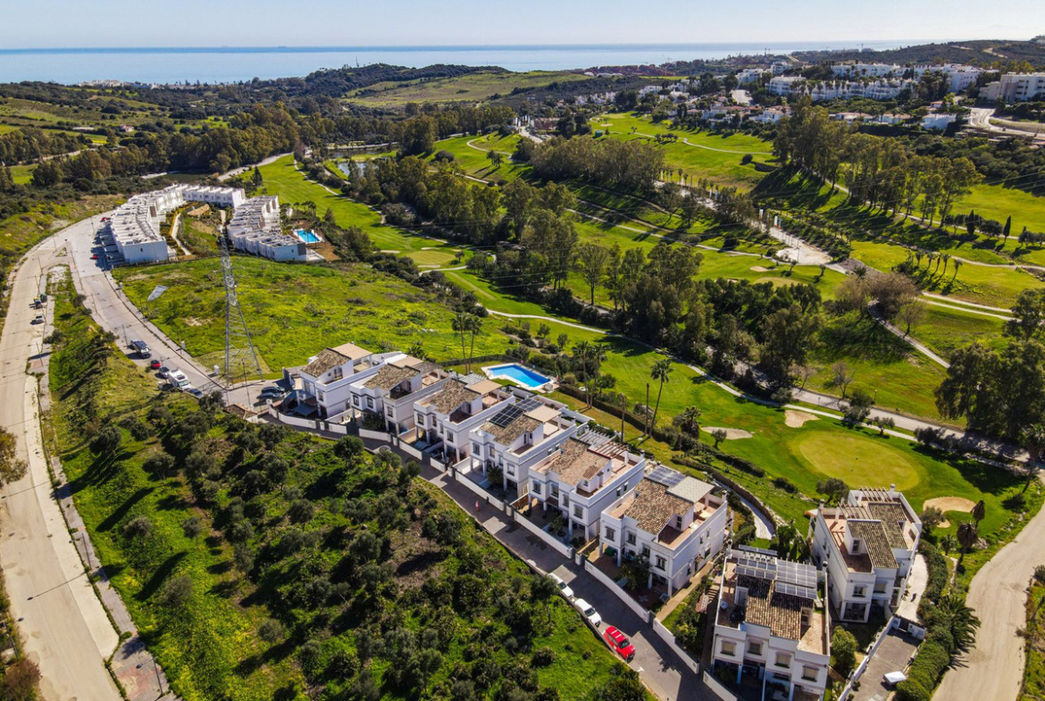 This beautiful and spacious corner townhouse in Estepona located in the heart of the Estepona Golf course offers panoramic views of the Mediterranean Sea and the mountains of the Sierra de Bermeja. The project near Estepona golf is just 5 minutes drive from Estepona town and 20 minutes from Marbella, making it an ideal spot for those seeking a balance between nature and city amenities.