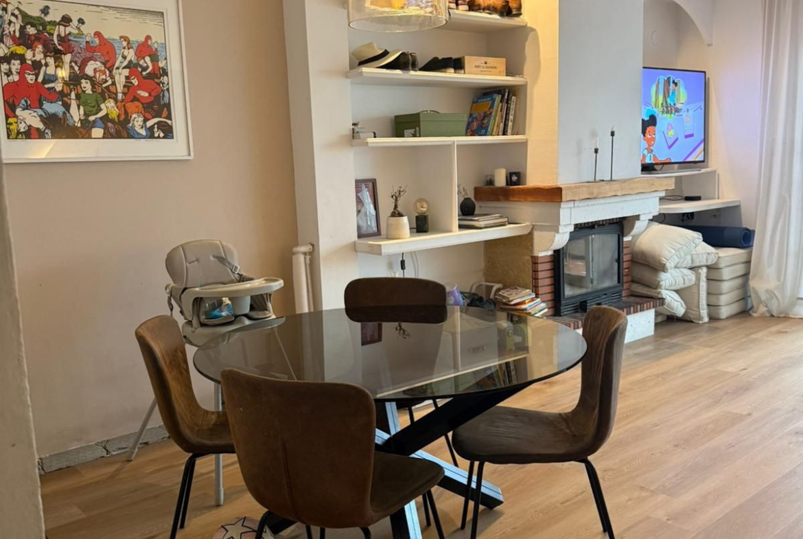 Main floor: Bright, very spacious living-dining room with fireplace, opening onto a magnificent terrace-porch and the communal garden with swimming pool, ideal for keeping an eye on the little ones. Kitchen and guest toilet on the same floor.