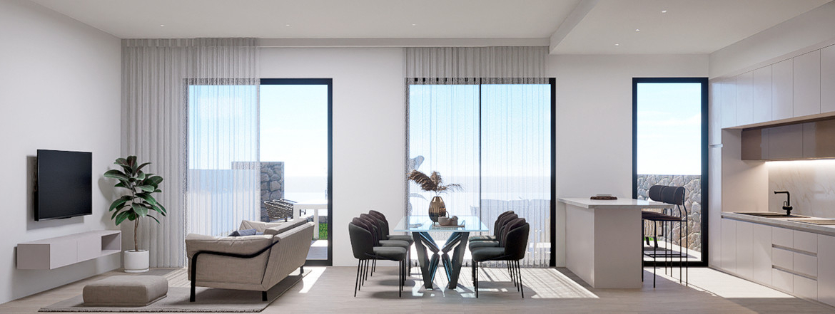Homes with terraces, 2 or 3 bedrooms, and 2 bathrooms, featuring a spacious living area, panoramic views of Benidorm city and the Mediterranean Sea, and natural light throughout the house.