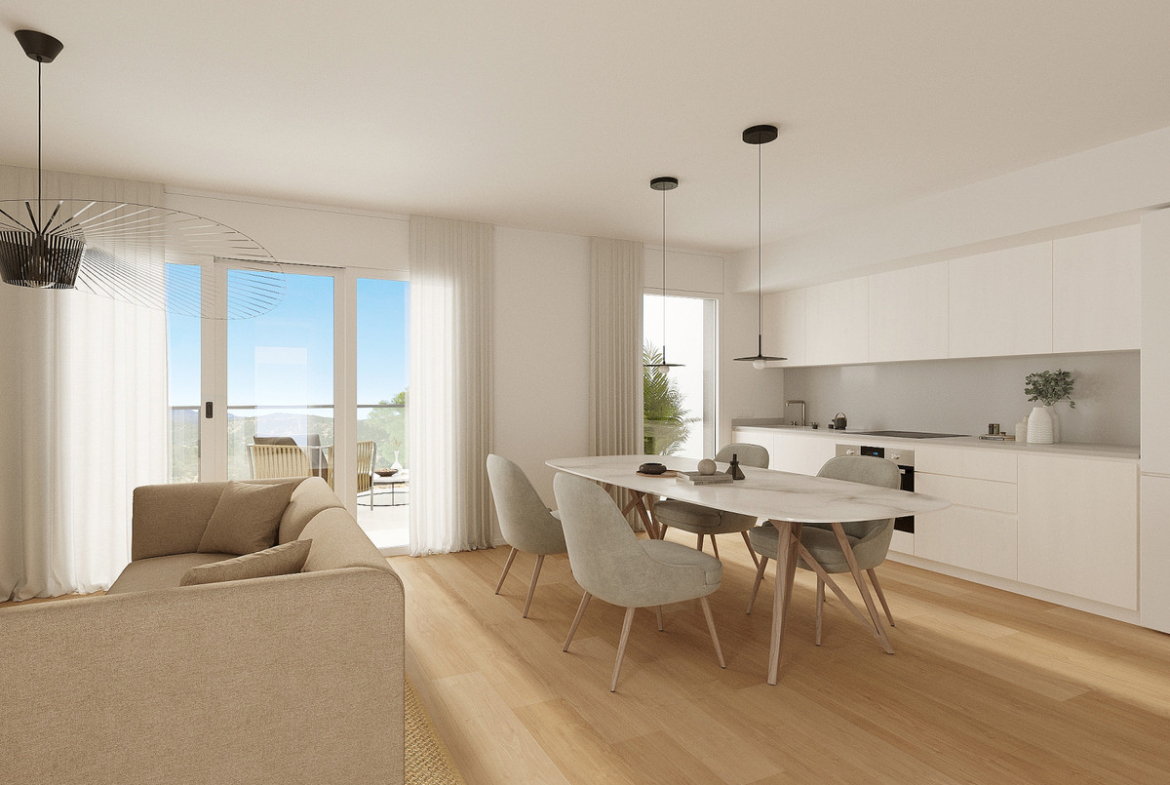 Built with excellent, high-quality materials, the new homes form an attractive residential complex, with private outdoor parking, storage rooms, garden areas and a children’s play area. The apartments share a communal swimming pool. In the case of terraced houses and villas, a private swimming pool is optional.