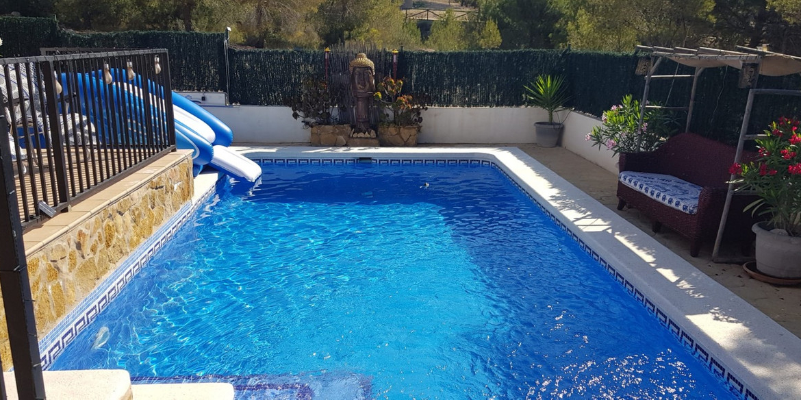 Built in 2008, the home offers 3 spacious double bedrooms, 3 full bathrooms, an additional guest toilet, an independent fully equipped kitchen, and a bright living room with three large patio doors opening onto the private terrace and 8×4 m pool. A ground floor guest bedroom features its own en-suite and opens to a terrace with a fish pond and waterfall.