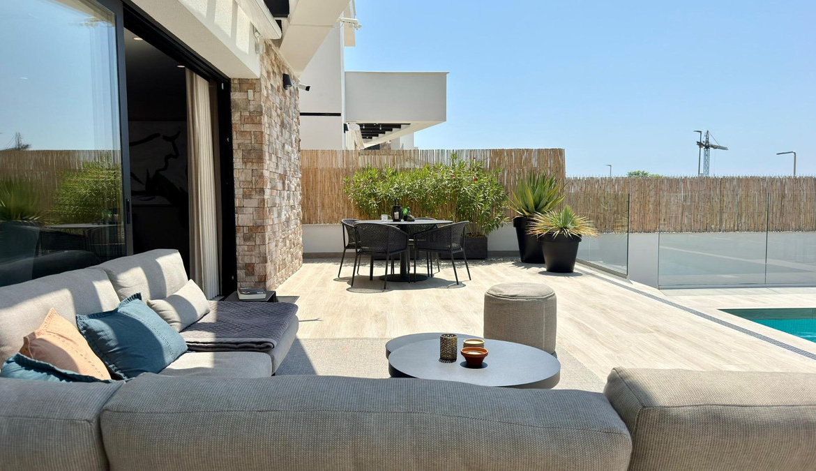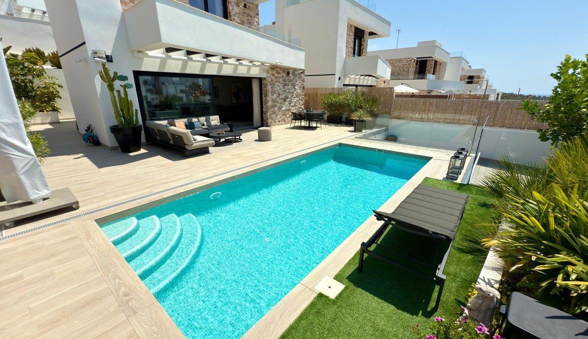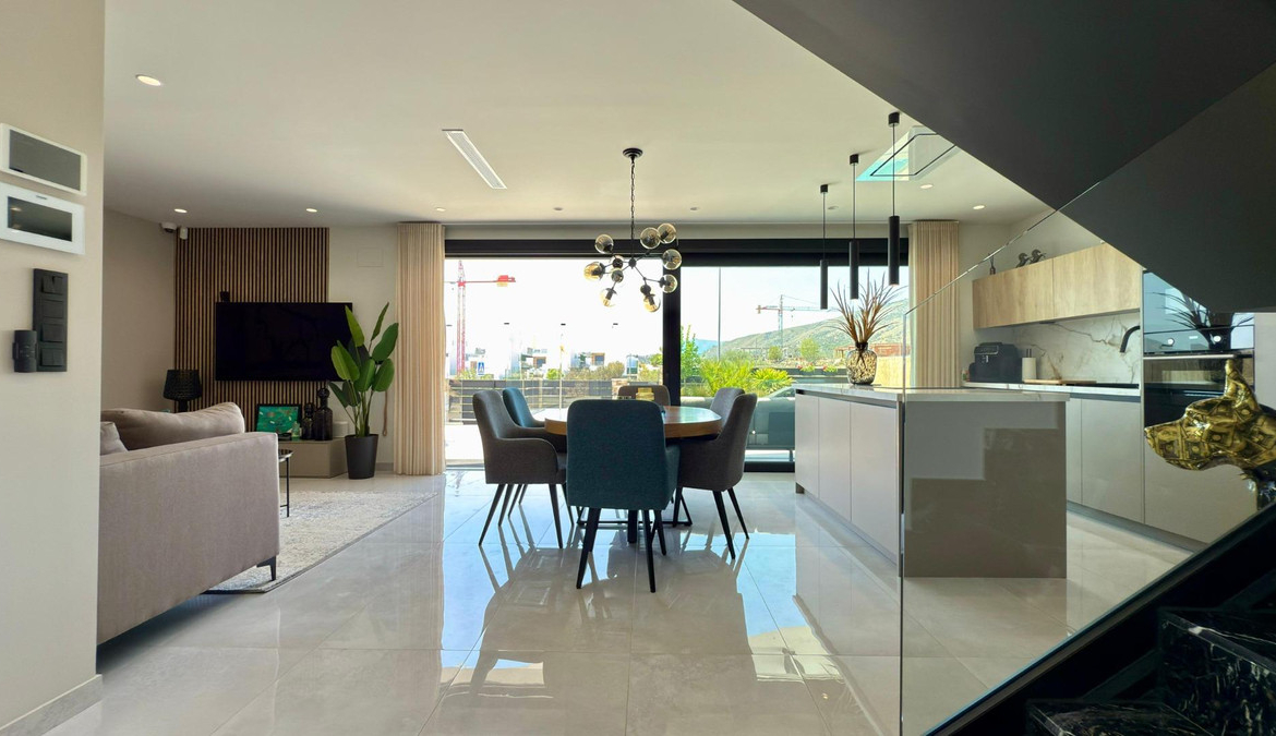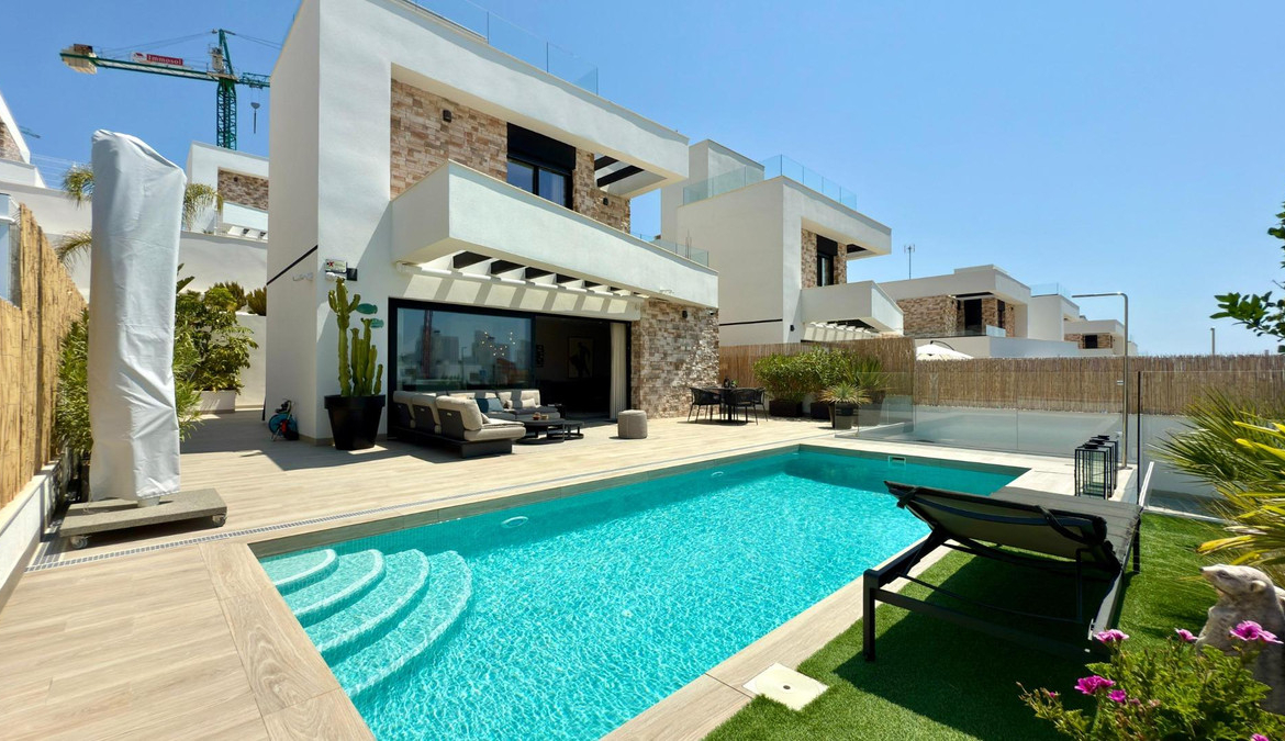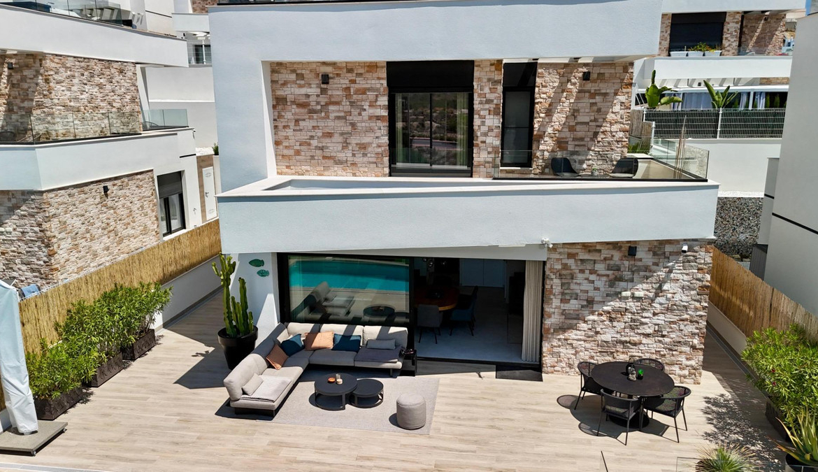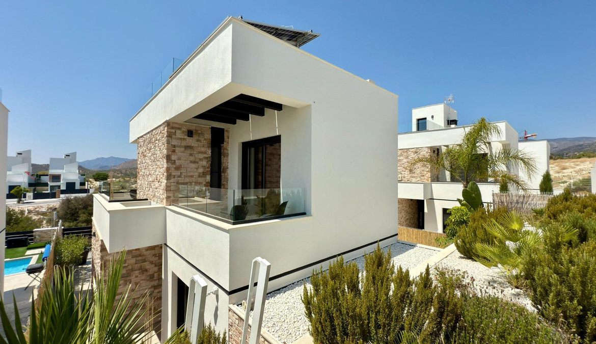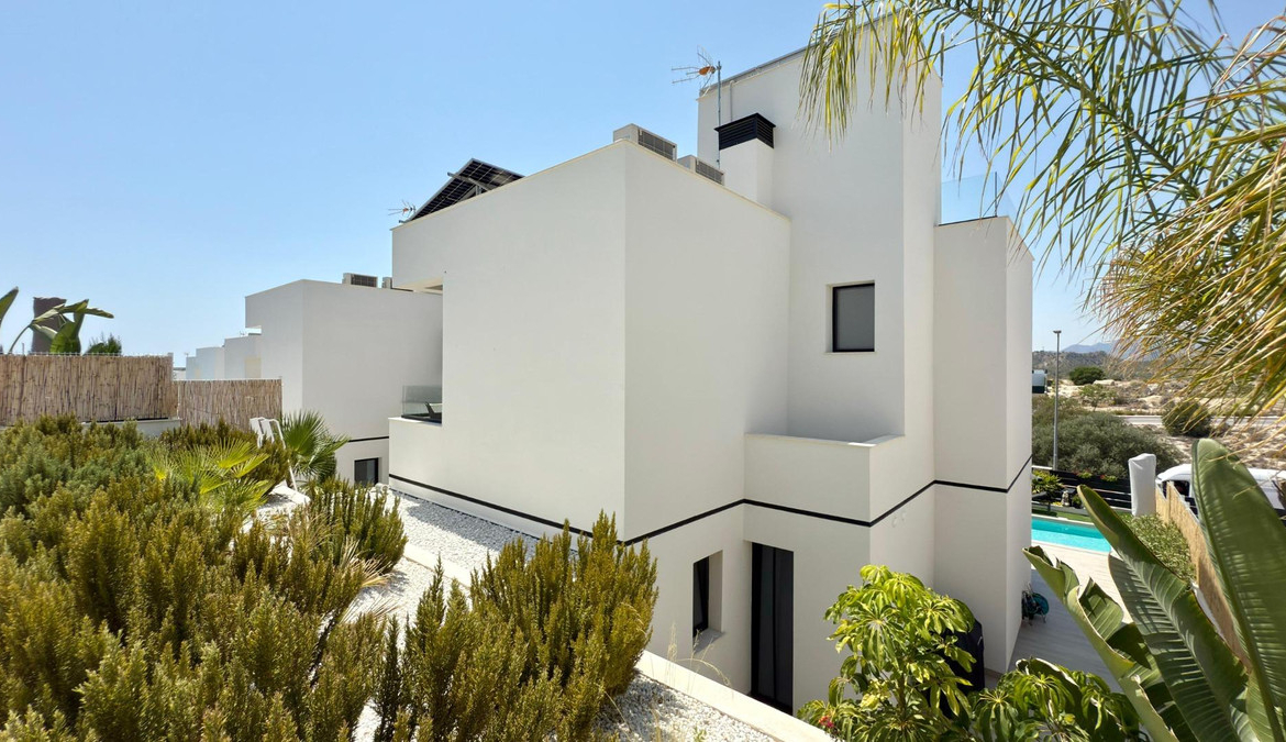 Where Elegance Meets Comfort ????We present to you a real estate gem: an independent, modern, and nearly new villa, designed with the highest quality materials and decorated with exquisite taste. A dream home where every corner is designed to surprise you.With 2 floors plus a solarium, this exclusive property features 3 spacious bedrooms and 3 designer Italian bathrooms, two of which have private terraces so you can wake up every day to open views of the sea and mountains. The bright living room and elegant kitchen, equipped with state-of-the-art appliances, integrate with the exterior, creating a perfect environment for living and enjoying.Outside, a spectacular garden filled with palm trees, flowers, and green areas surrounds a heated saltwater pool with a cover, ideal for enjoying all year round. The large terrace is perfect for gatherings, dinners under the stars, or simply relaxing in your own private paradise.✨ Premium Features that Make a Difference:- Mitsubishi Slim air conditioning- Solar panels with hybrid inverter- Water softener- Integrated alarm with indoor and outdoor cameras- Electric shutters- Dimmable interior and exterior lighting- 8 m² storage shed made of concrete and wood- Heated saltwater pool with cover- All furniture, curtains, washing machine, dryer, and part of the outdoor furniture includedLocated in Balcon de Finestrat, a step away from Puig Campana Golf, close to shopping centers, services, restaurants, and with quick access to the Alicante highway, this villa is more than a house… it’s a lifestyle.A home where quality, design, and location come together to create an exceptional property.