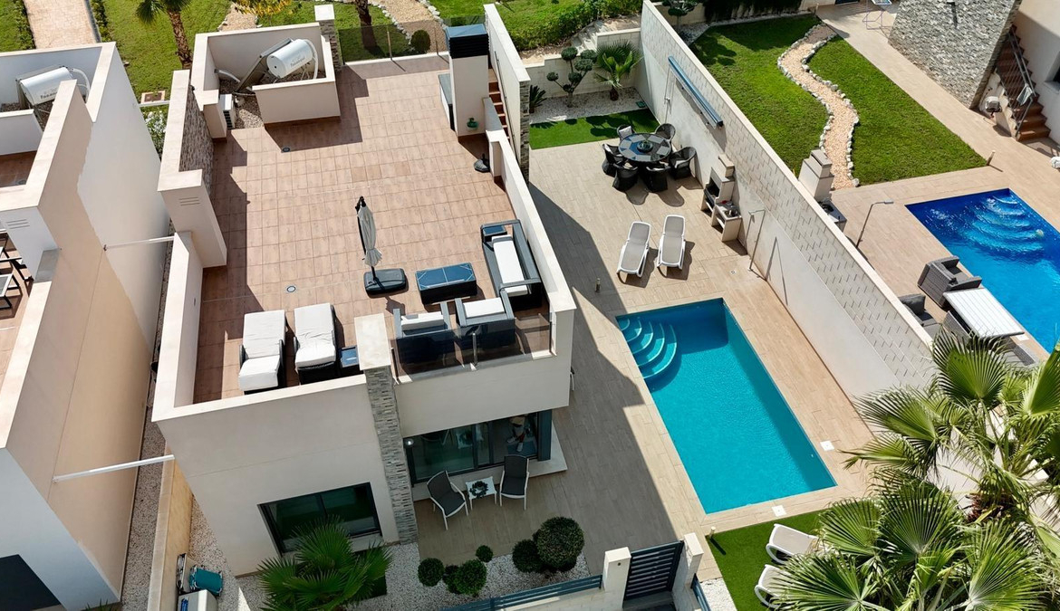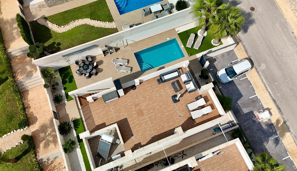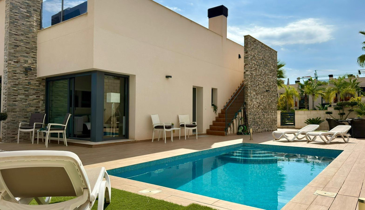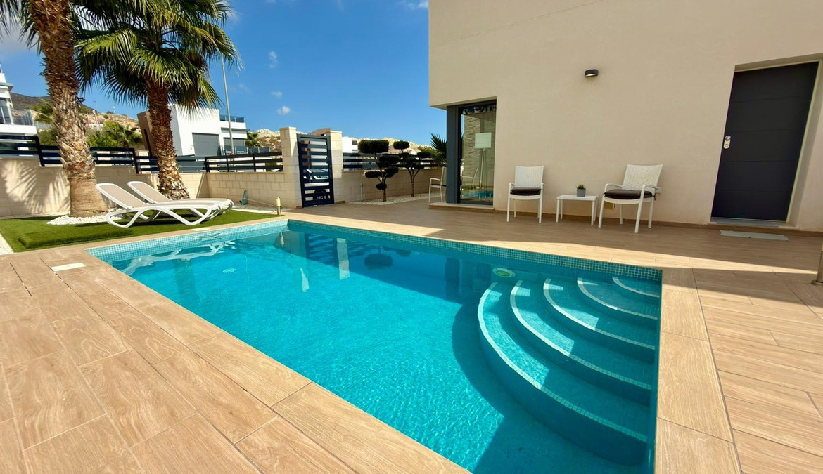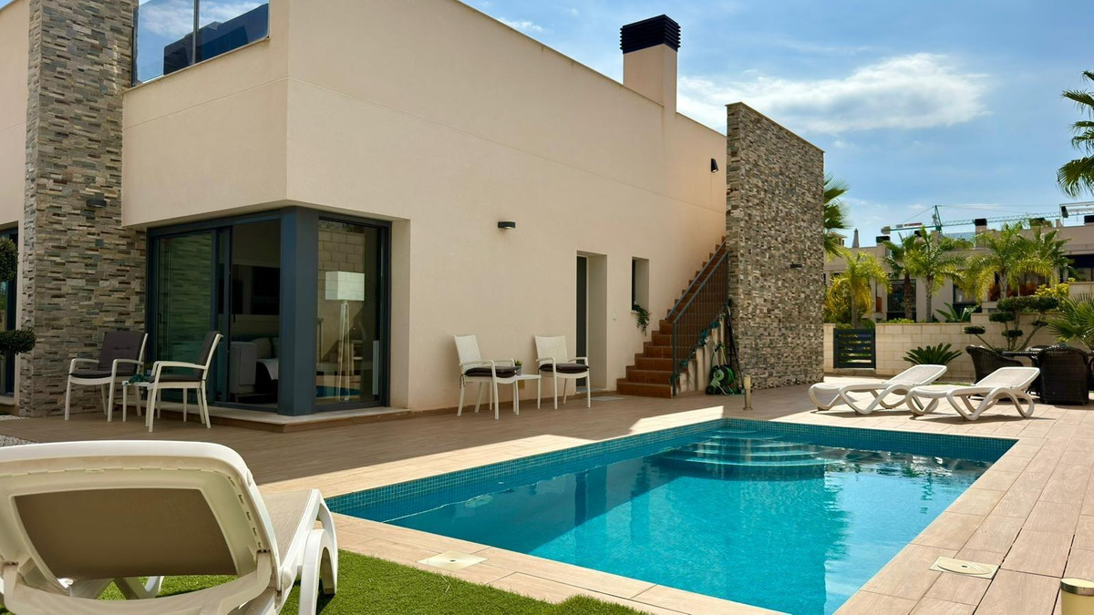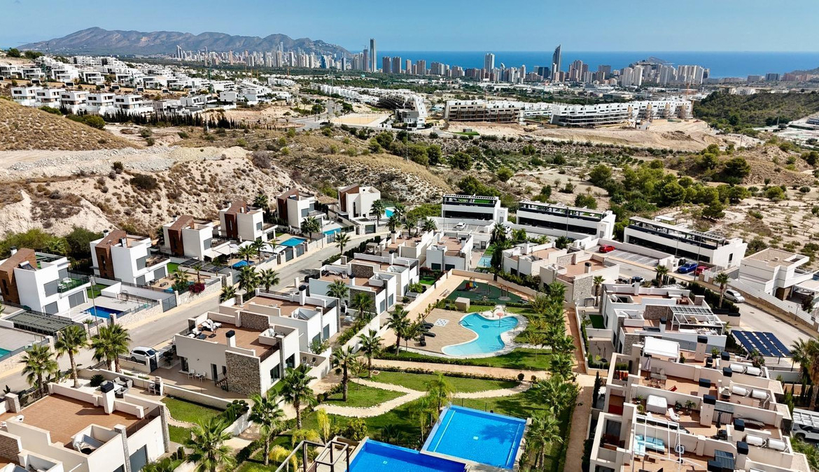 Discover this spectacular detached villa built in 2019, with a constructed area of 109 m², located in one of the most exclusive and peaceful areas of Finestrat, just 5 km from the Mediterranean beaches. This property combines luxury, comfort, and privacy in a paradisiacal environment, ideal for those seeking quality of life and tranquility.The villa features three spacious bedrooms and three elegant bathrooms, offering space and comfort for the whole family. The living room is bright and cozy, perfect for sharing unforgettable moments, while the open-plan kitchen is fully equipped to facilitate modern and functional living.Outside, the villa boasts its private pool, surrounded by a beautiful garden with palm trees and lush vegetation, creating an oasis of relaxation and privacy. Additionally, it has a solarium with stunning sea views, where you can enjoy Mediterranean sunsets and the sea breeze.The property is part of a community that offers a large green area, community pool, jacuzzi, sauna, and a fully equipped gym, combining luxury and wellness in one place.Finestrat is a charming and very quiet place, surrounded by nature and open spaces, ideal for those seeking peace and privacy. Very close by is a golf course, perfect for sports enthusiasts, and just a few minutes from the beaches. The area is safe, pleasant, and offers a relaxed atmosphere without the hustle and bustle of the city.Built with high-quality materials, modern design, and luxury finishes, this villa is ideal for those seeking a sophisticated and exclusive lifestyle, enjoying the sun, nature, and sea views. A unique opportunity to acquire a property that combines luxury, comfort, and a privileged location.Don't miss the chance to live in this gem in Finestrat, a place where every day feels like a dream vacation.