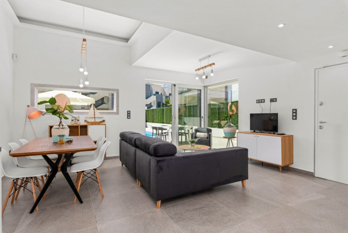 An exceptional contemporary style detached villa built over three floors and just 3 years old is immaculately presented.  You enter the west facing garden onto a large tiled terrace surrounding the private heated pool with Roman steps, with ample space for sun loungers plus off road parking. It is a private space with a dining/seating area complete with sun awnings and patio doors leading into the lounge.  On entering the villa itself you are met with a very spacious and open plan living area with high ceilings and lots of natural sunlight. There is a lounge with patio doors out to the swimming pool, a dining area and fully fitted kitchen. Also on this floor there is a guest cloakroom, and the master bedroom with an en-suite shower and dressing room area with large fitted wardrobes. Stairs lead to the first floor and 2 further double bedrooms, each with fitted wardrobes and a family bathroom. From the landing you can also access a large two level terrace with water and electric supply, perfect for a jacuzzi maybe! A further staircase leads to the fantastic solarium with lovely views of the surrounding area, plenty of dining and relaxing space and a superb summer kitchen with an electric shutter to protect from the sun/rain, with water and electric supply, a sink, fridge, microwave, cupboards, drawers and work surface. This simply stunning property is being sold fully furnished to a high standard and is an absolute gem not to be missed!