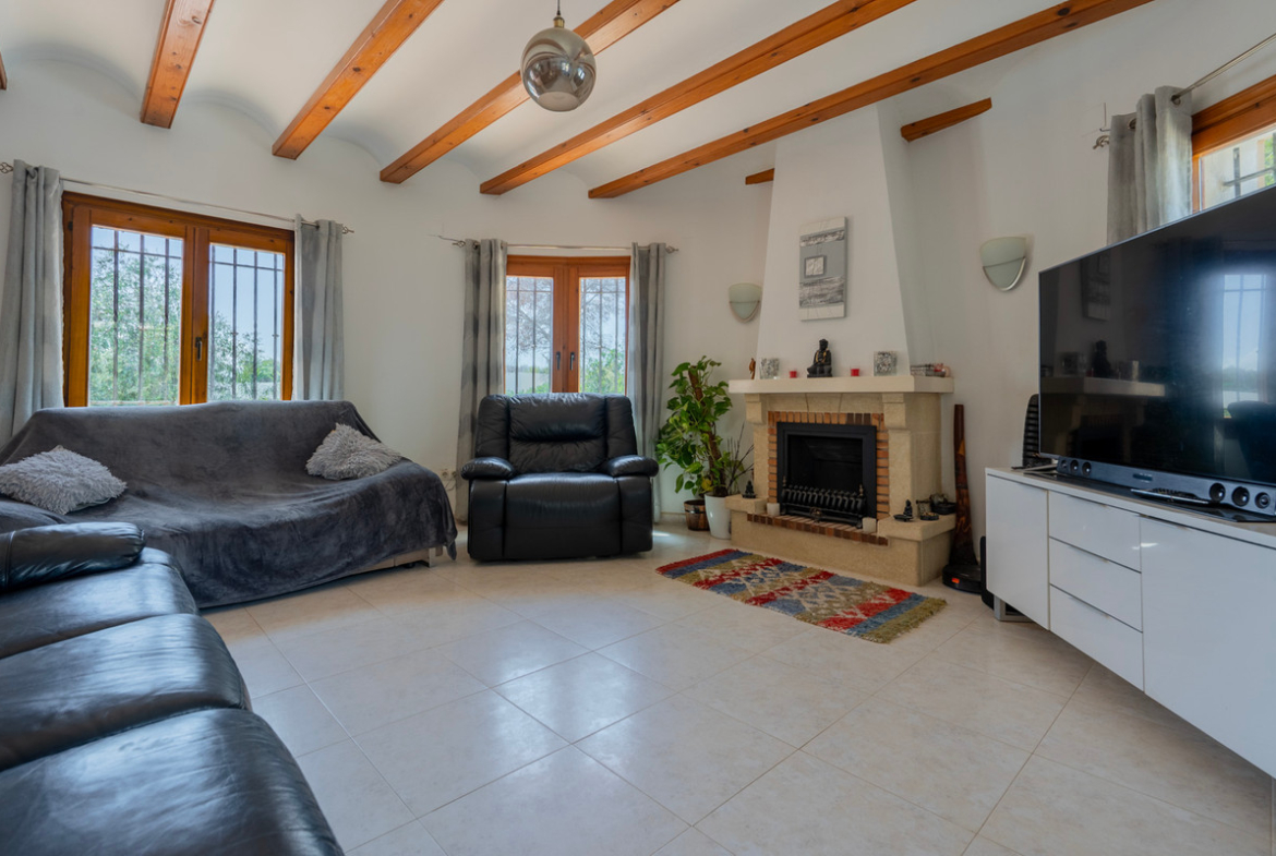 The property is entirely on one level and features a cozy living-dining room with a fireplace and an adjoining semi-open kitchen. There are three double bedrooms in total, one of which has an en-suite bathroom, plus a separate bathroom. Both the living room and the master bedroom have direct access to a spacious covered terrace by the pool, the perfect place to relax and enjoy the Mediterranean climate. A few steps down is a sunny uncovered terrace with a barbecue. The villa also has a low-maintenance Mediterranean garden with palm trees, flowering shrubs, and a pomegranate tree.