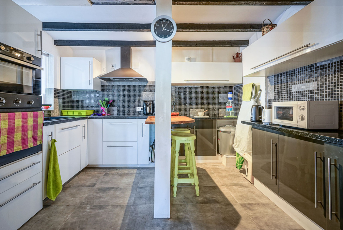 This traditional villa is situated on a flat, sunny plot of 1000 m2 and offers lovely views over the wooded hills behind Javea. The villa is south-facing and spread over two floors. You enter a very spacious naya, from where there is access to the living-dining room with a bar. The living-dining room is characterised by the traditional arches made of Tosca stone and the high ceiling. Adjacent is a spacious, modern kitchen. From the living room there is access to a second lounge from where a staircase leads upstairs. Next to the staircase is a single bedroom. The upper floor comprises a double bedroom with an en suite bathroom and a single bedroom. There is also a guest toilet and a storage room on the ground floor. The villa has a swimming pool and lots of parking space. There are also several fruit trees on the plot including a lemon tree, 2 orange trees, a pomegranate tree, an almond tree and a fig tree. Javea town centre can be reached in less than 10 minutes. The villa has a business licence and has been a well-established restaurant for many years. Video on request.