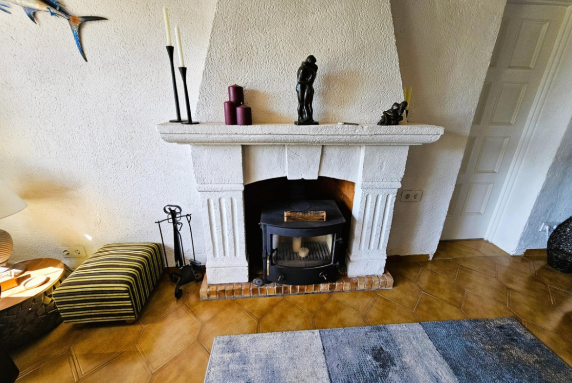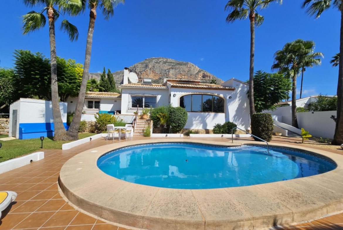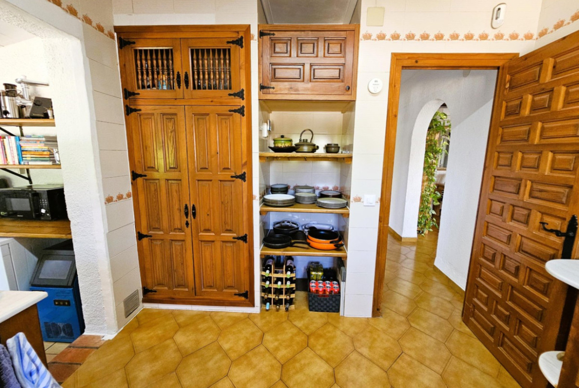 Beautiful traditional villa in Jávea, just a few minutes' drive from the beach and all amenities. The villa is situated on a flat plot with a South orientation and is quite private. The property consists of three bedrooms and two bathrooms, the master bedroom has an en-suite bathroom with an Italian shower, built-in wardrobes, and a dressing room, while the other two bedrooms share a spacious bathroom with a bathtub. The living-dining room is very spacious and bright, with beautiful wooden beams on the ceiling and a lovely wood-burning fireplace, leading out to a large glazed naya. The kitchen is of good size and fully equipped, plus it has a pantry and a laundry/storage room. Outside, there is a lovely garden with grass and palm trees, illuminated with solar lights, a kidney-shaped pool of 8×4, surrounded by terraces and an outdoor kitchen with a barbecue and oven, inviting us to enjoy dinners with family and friends. The parking area consists of a carport for one car and parking for several cars. All rooms in the villa are equipped with air conditioning (hot/cold) and double-glazed windows with shutters and fly screens. Additionally, the property has solar panels and a natural water well of 20,000 liters. Don't miss the opportunity to visit this beautiful villa and make it your new home.