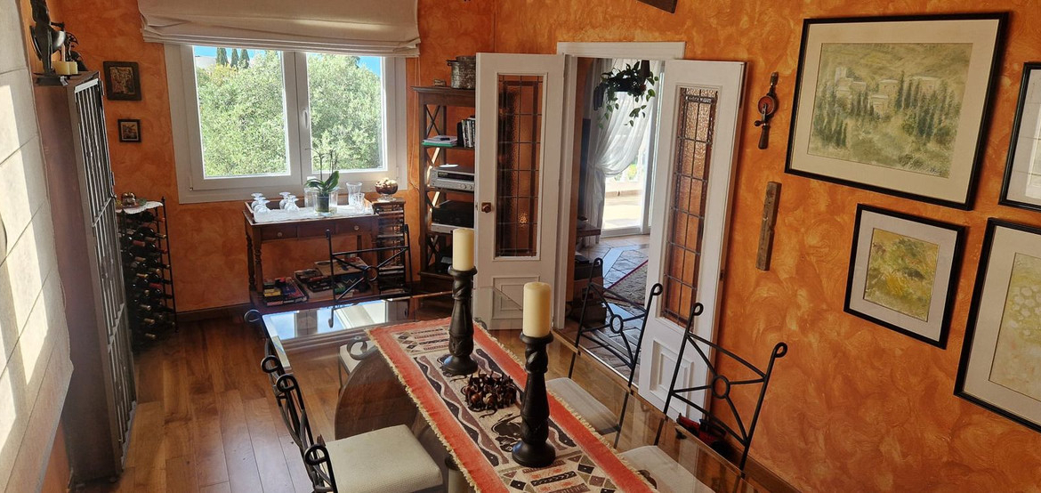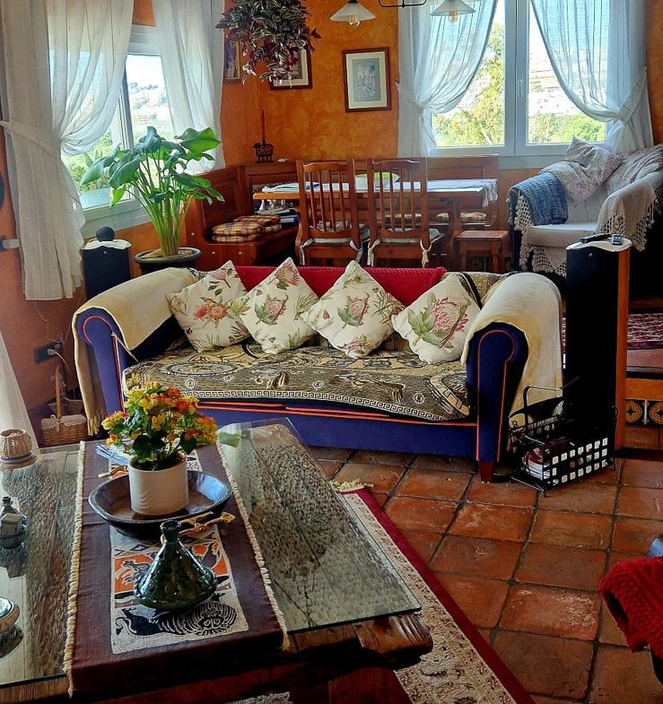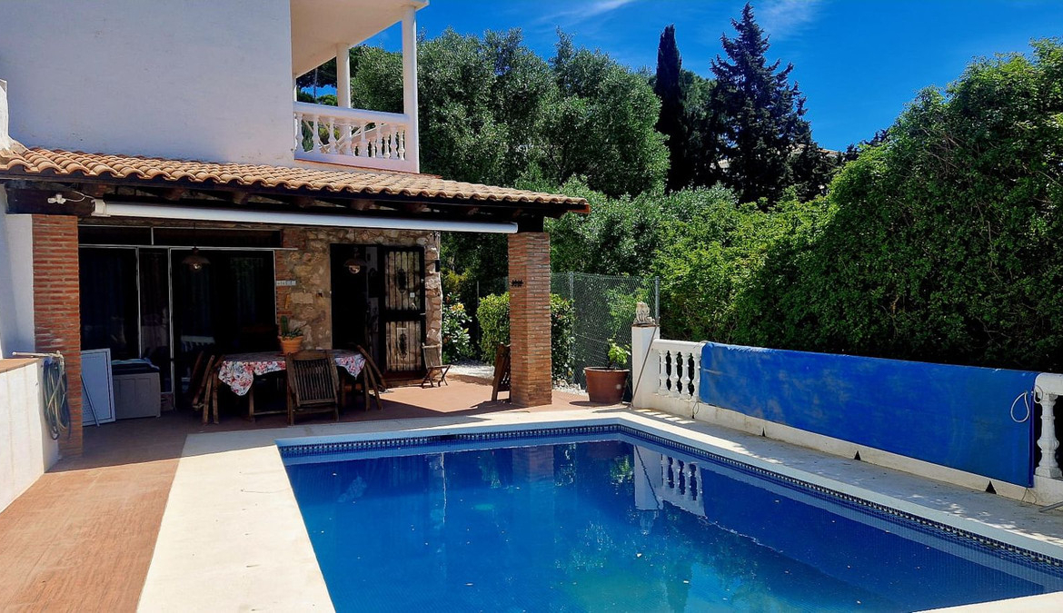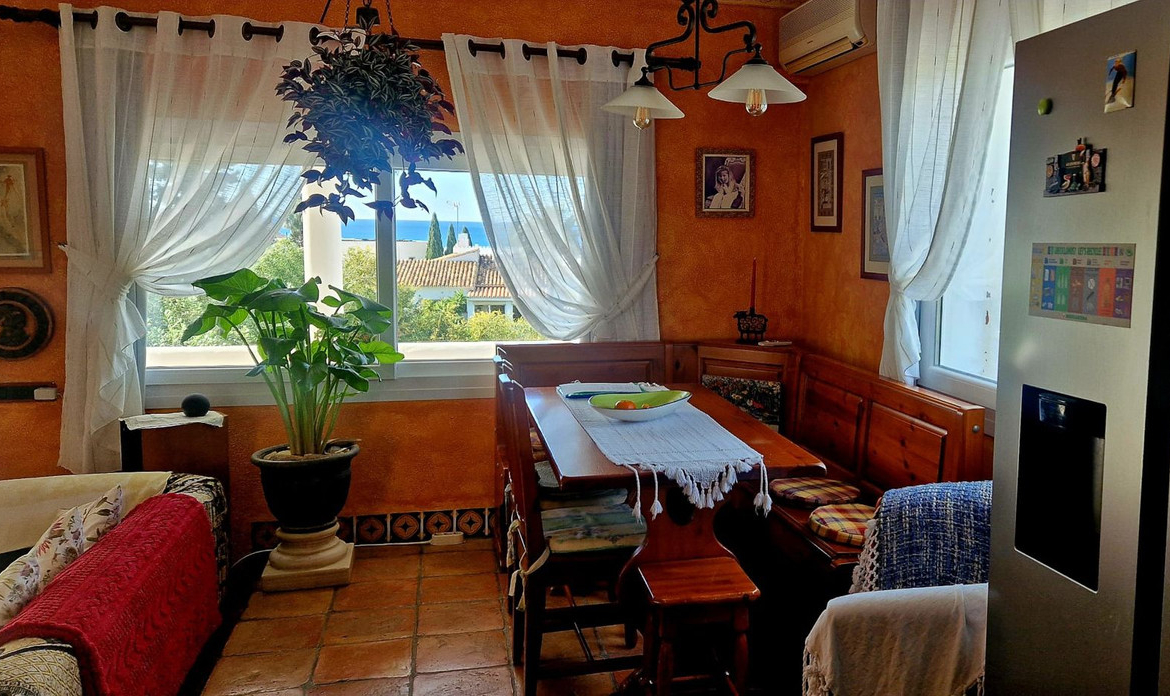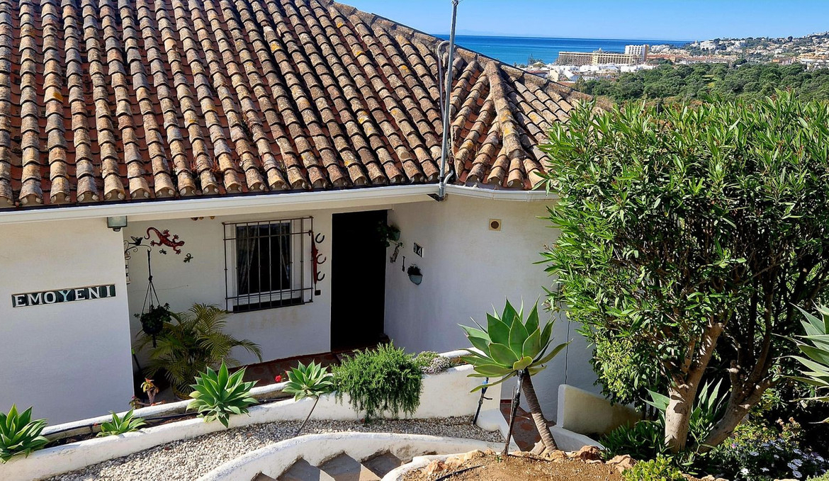 CHARMING VILLA JUST MINUTES WALK TO LA CALA VILLAGE!! Set in an elevated position above La Cala de Mijas, this charming villa enjoys panoramic sea views and a sunny south to southwest orientation. The property combines a characterful main residence—offering two bedrooms, two bathrooms, and a dressing room—with a self-contained guest apartment on the lower level, complete with its own kitchen and bathroom. Inside, the layout is both spacious and practical, with bright living areas, a separate dining room, and a well-sized kitchen upstairs, while the bedrooms below benefit from naturally cooler temperatures during summer. Expansive terraces on both levels create ideal spaces for relaxing or entertaining, while a private pool and sheltered sun terrace provide a high level of privacy, further enhanced by the green zone directly in front. Additional highlights include double glazing, solar energy for hot water and electricity, high-speed internet, and off-road parking in a peaceful cul-de-sac, all within easy walking distance of the village and local amenities. The home is offered fully furnished, ready for immediate occupancy.