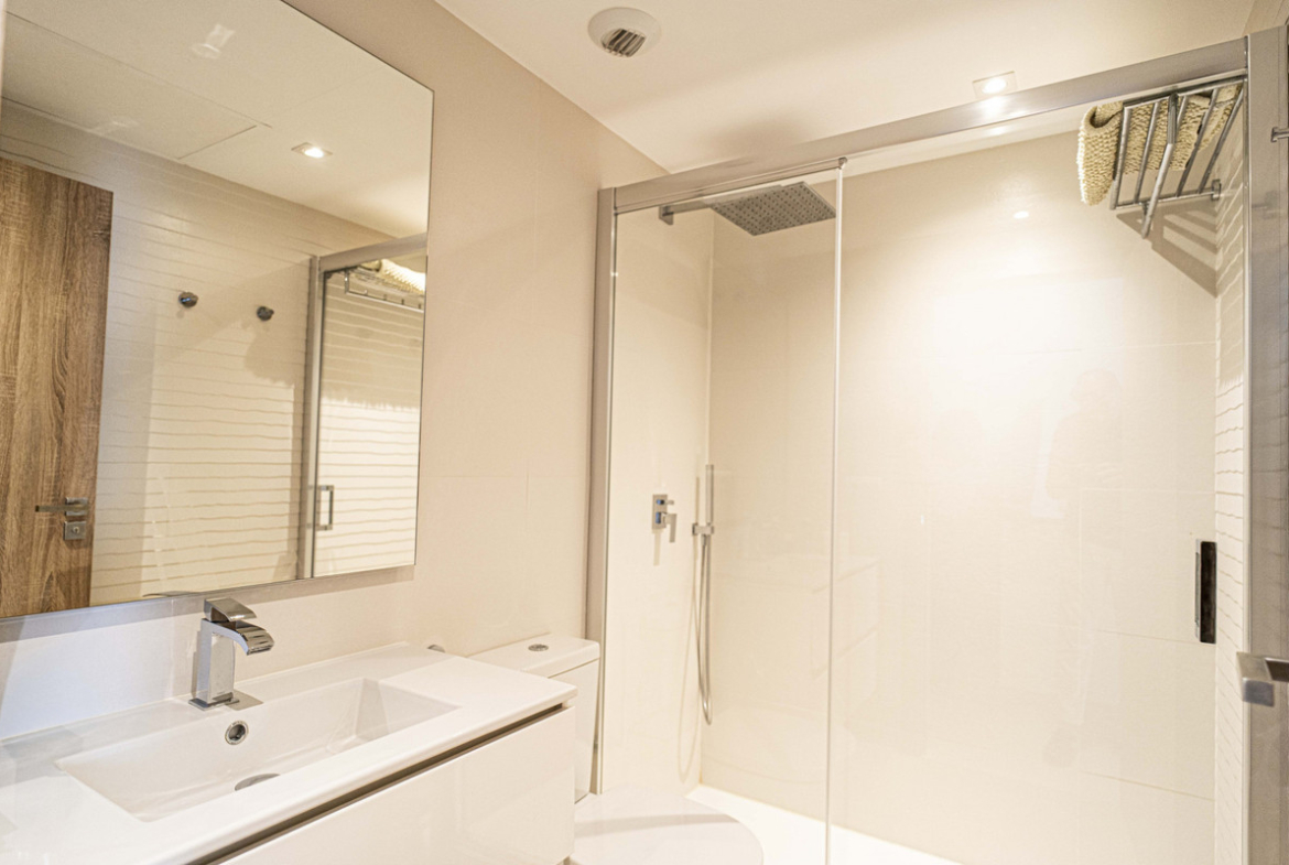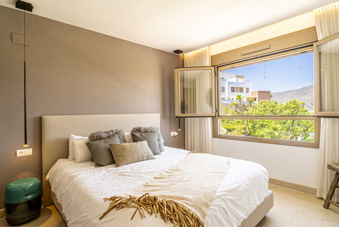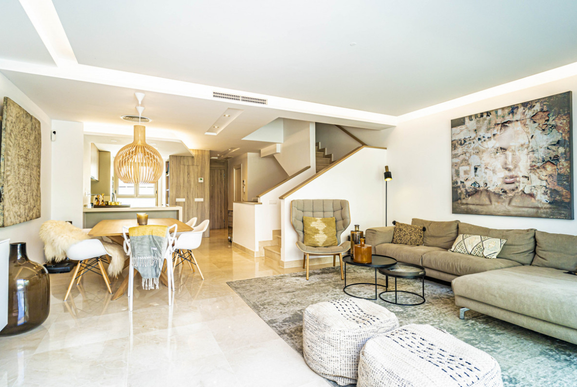 This stunning property offers spacious open-concept living and dining areas that flow seamlessly onto a magnificent terrace with breathtaking views of the golf course and surrounding mountains. The modern kitchen, fully equipped with electrical appliances and a stylish peninsula, connects effortlessly to the dining space—ideal for entertaining.