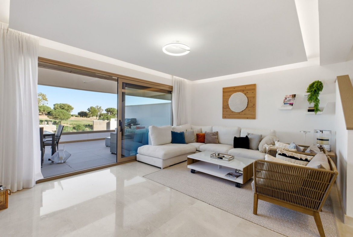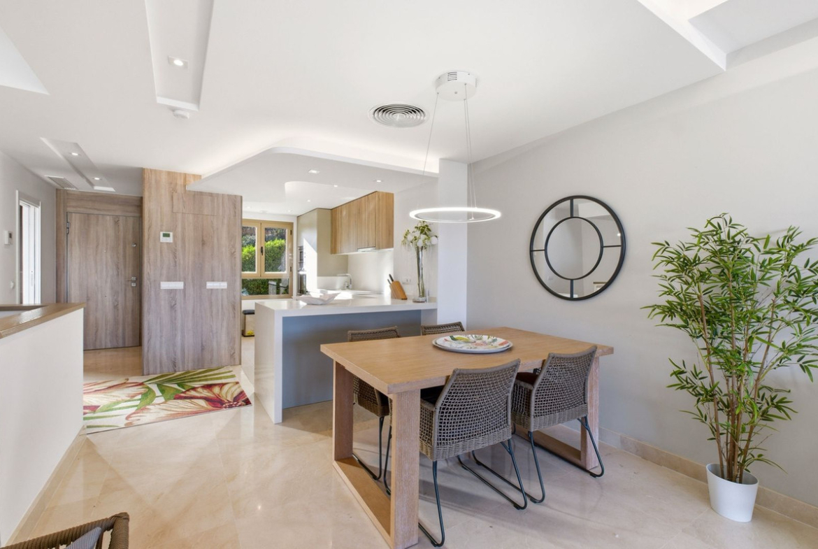 The main living area is bright and open, with a lounge and dining space that flows straight out onto a private terrace and through large sliding doors. It’s a great space for relaxing, having friends over or just enjoying a meal outside. The kitchen is fully fitted and connects nicely with the living space, so everything feels open and easy to use.