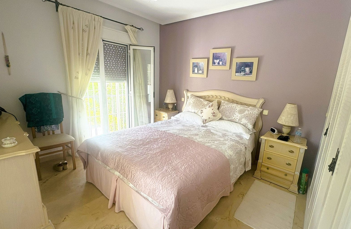 Upstairs, the main bedroom opens onto a private terrace with elevated views over the garden, the golf course, and extending towards the sea—a serene setting to enjoy your morning coffee or watch the sunset in complete privacy.