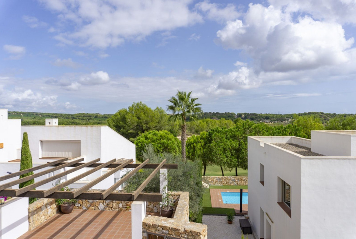 3 bed luxury villa in Las Colinas Golf for sale. This amazing villa is on the Jacaranda Estate in a gated community with private parking. The living room has a high vaulted ceiling with a dining area leading out onto a large outer garden area with an electric toldo covering a dining table for al fresco dining. The property features two private parking spaces. The house has a beautiful communal pool which is only shared with 14 villas, and space for a private pool if desired.